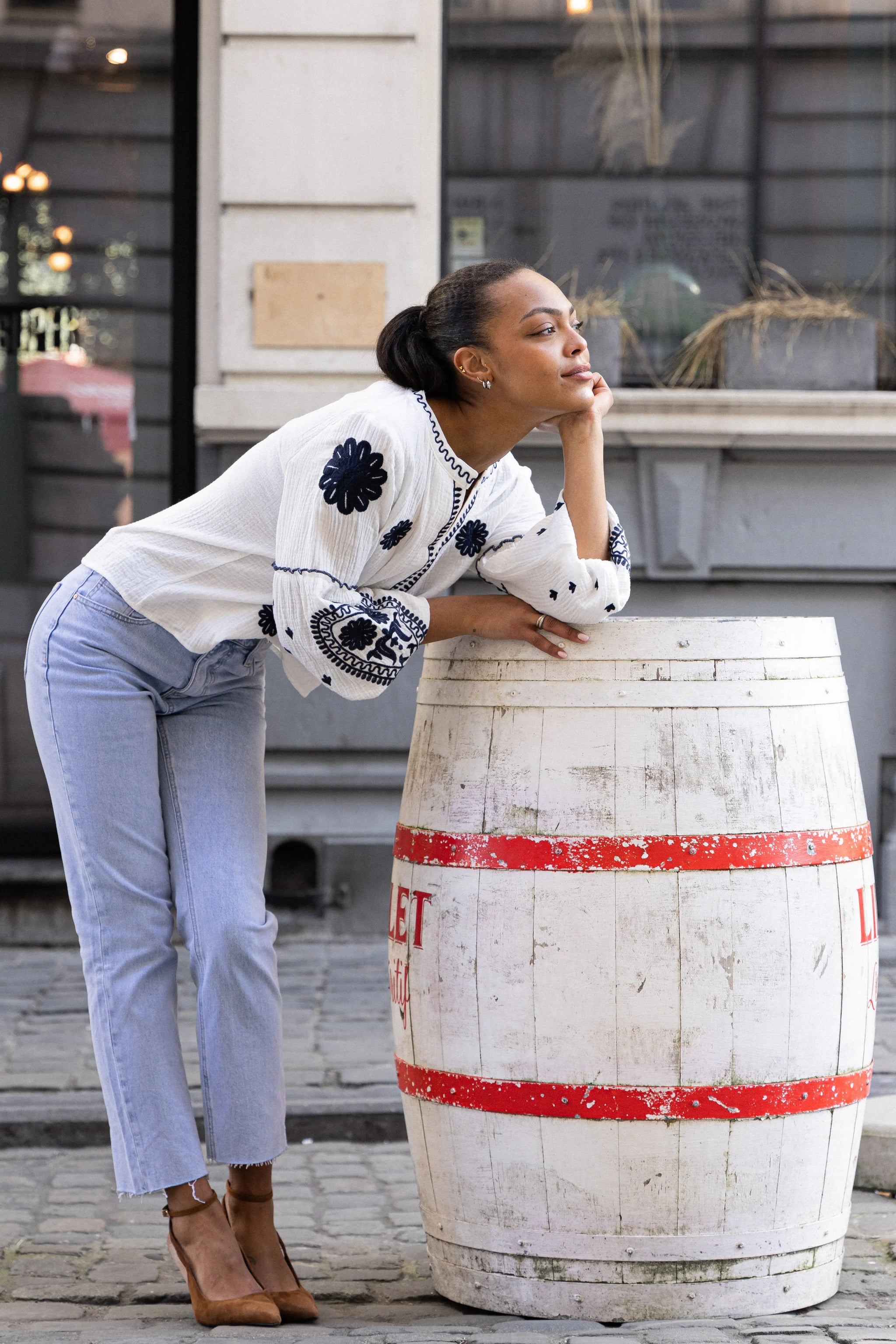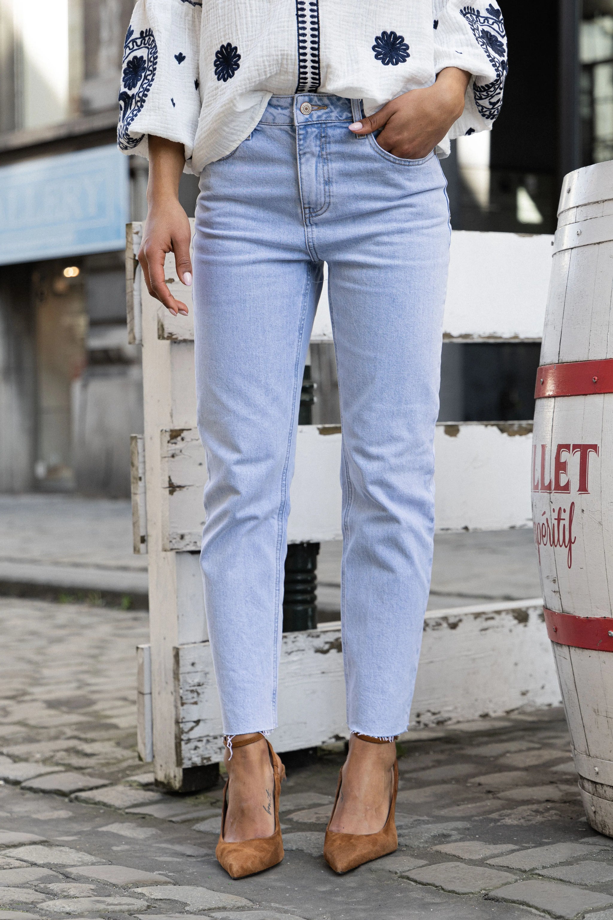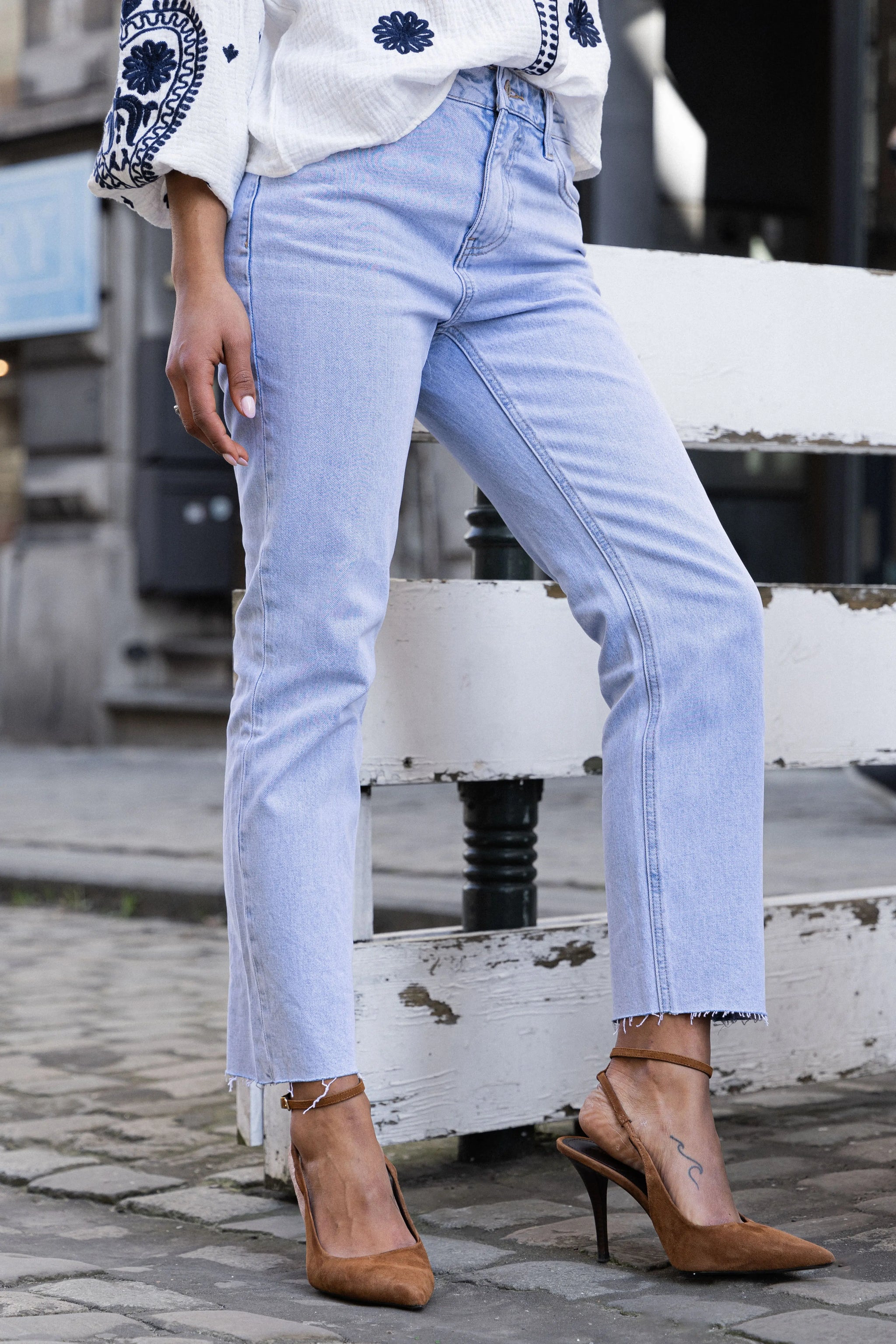 Jean slim taille haute en denim clair, avec ourlets effilochés et fermeture boutonnée. Coupe ajustée qui allonge la silhouette