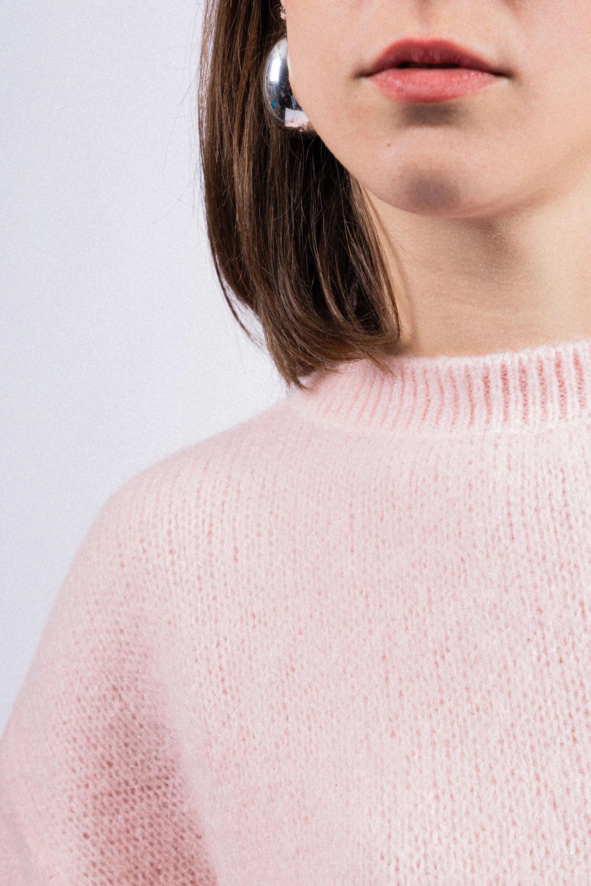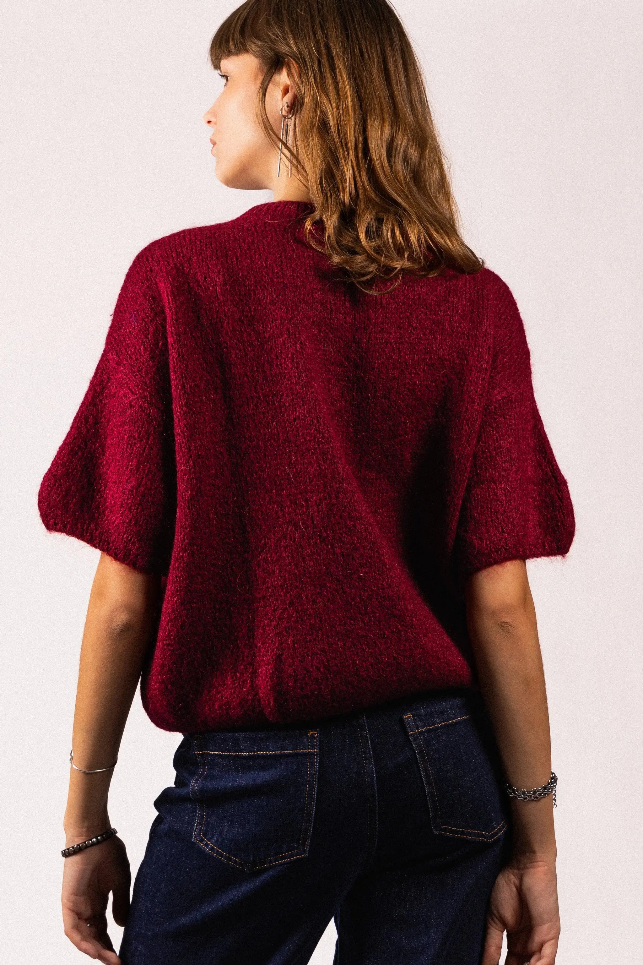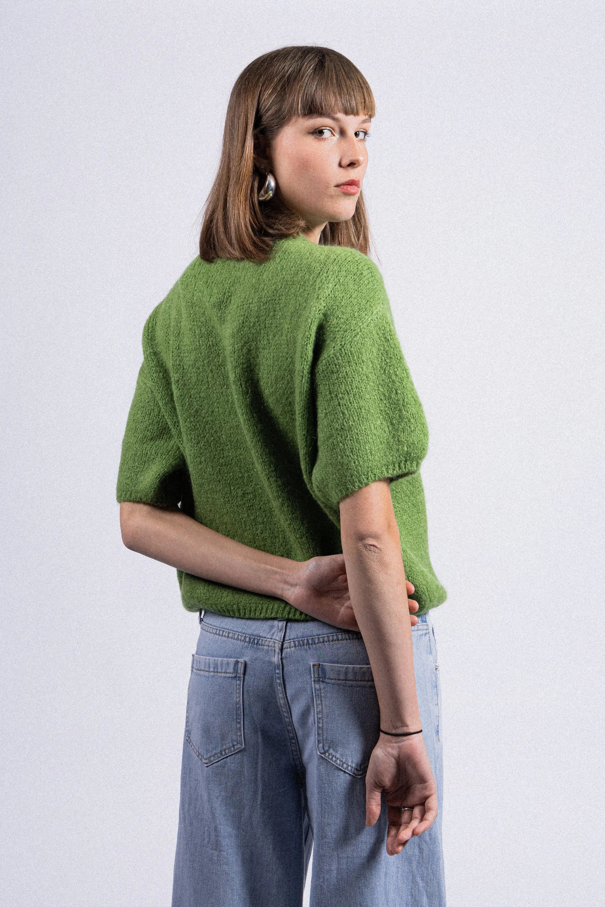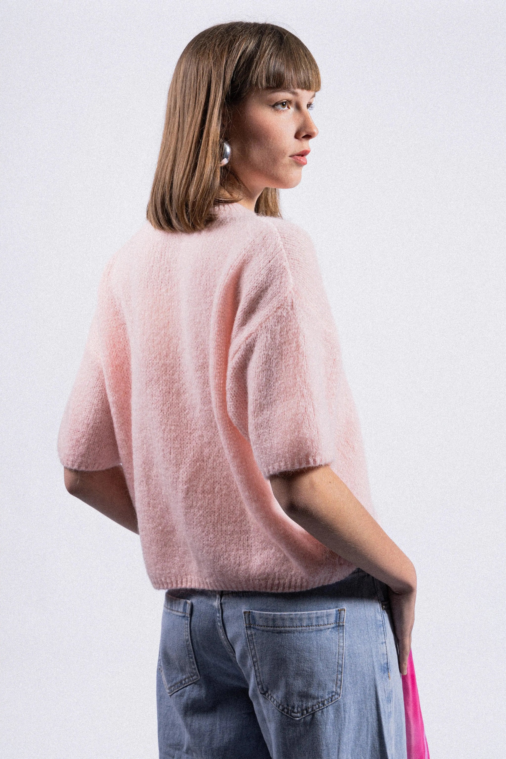 Pull doux en maille duveteuse, manches courtes légèrement ballon.