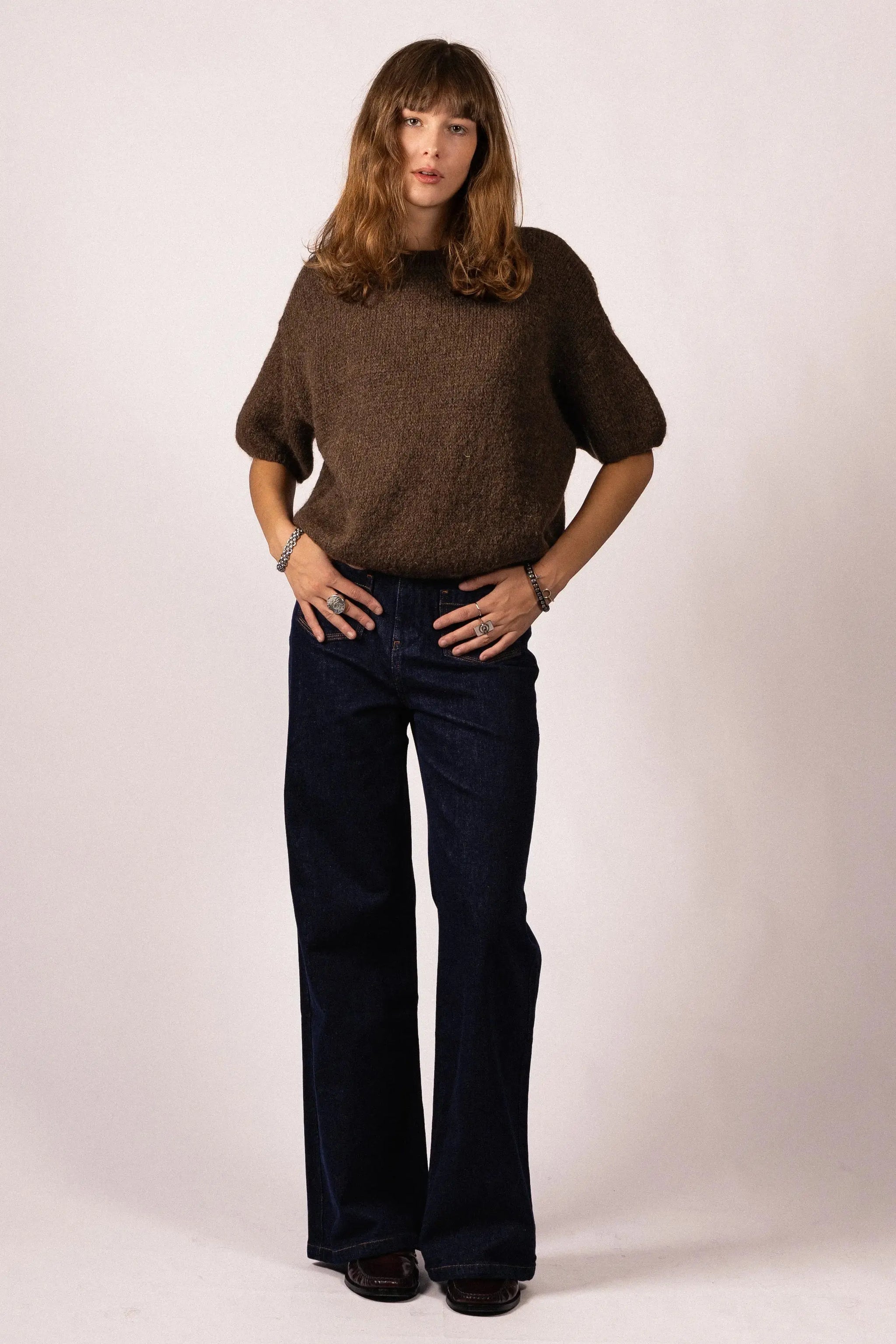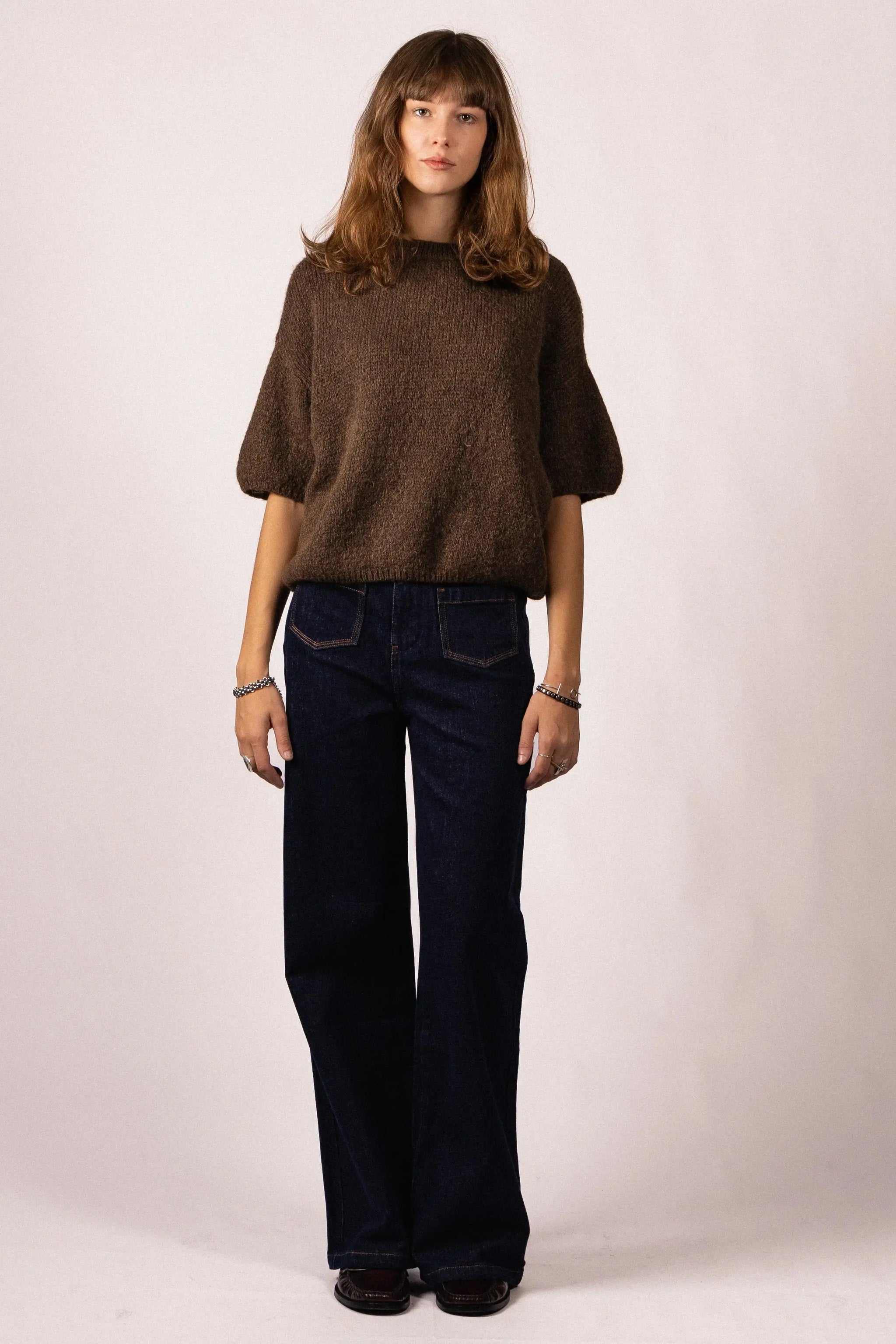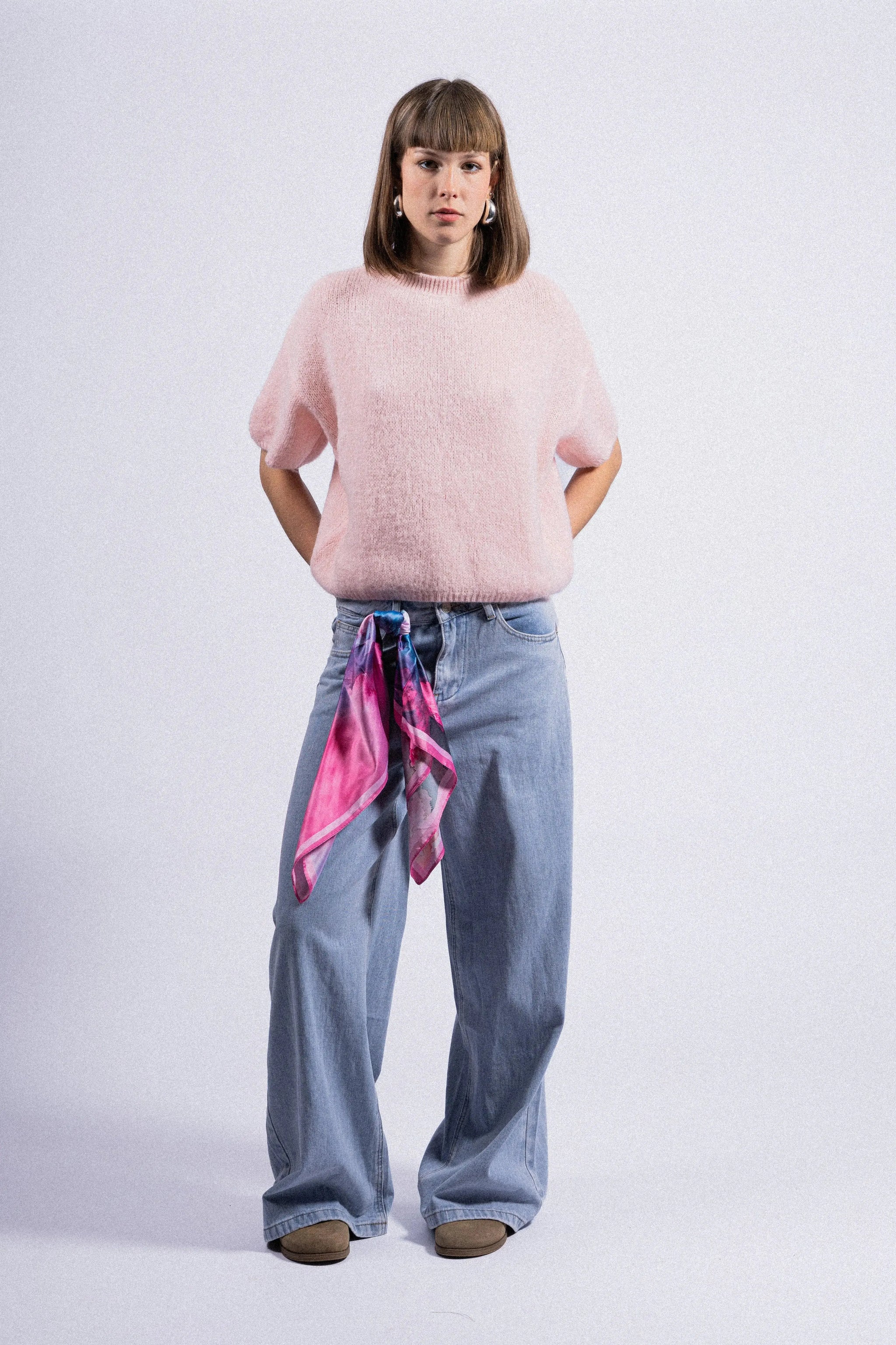 Pull doux en maille duveteuse, manches courtes légèrement ballon.