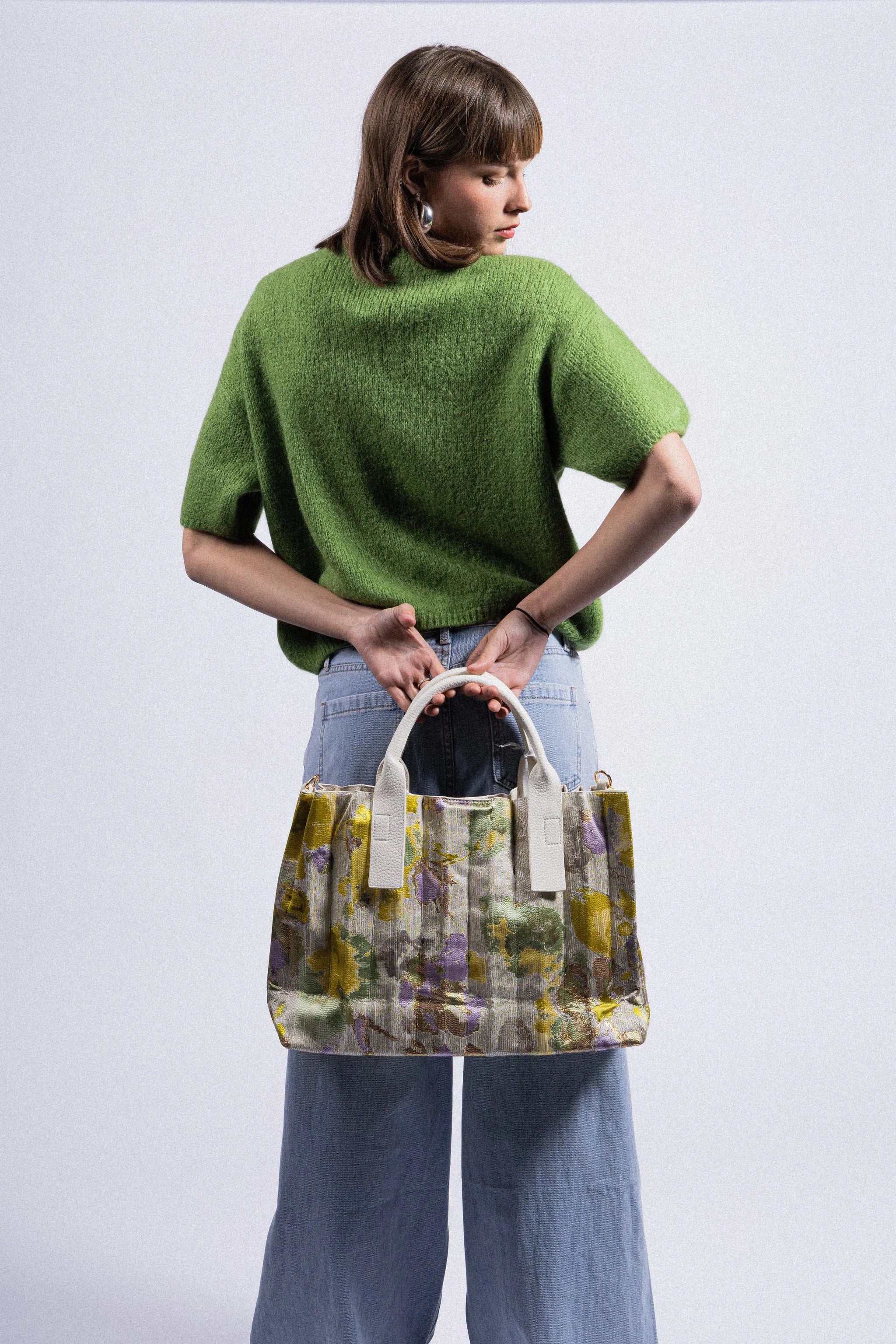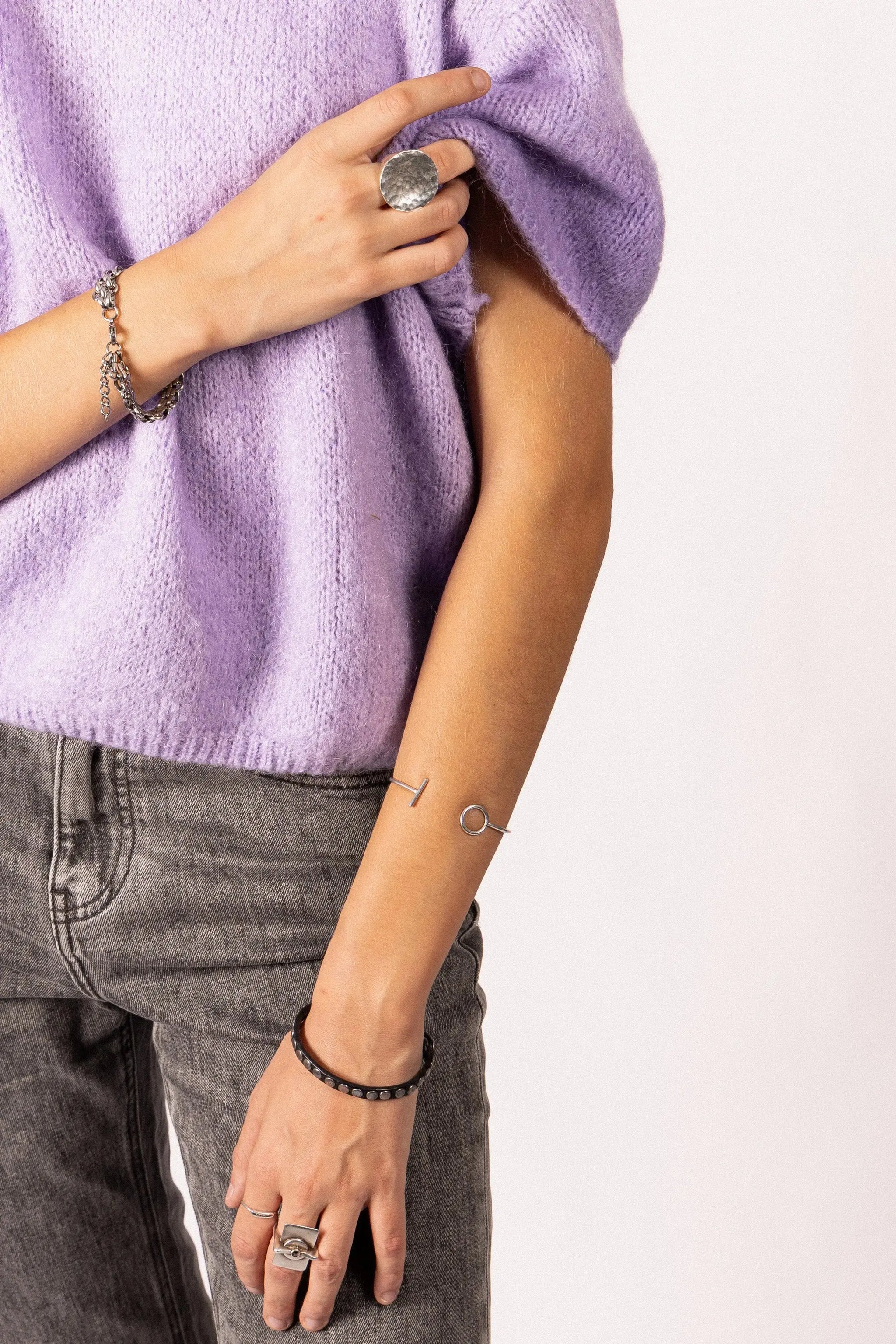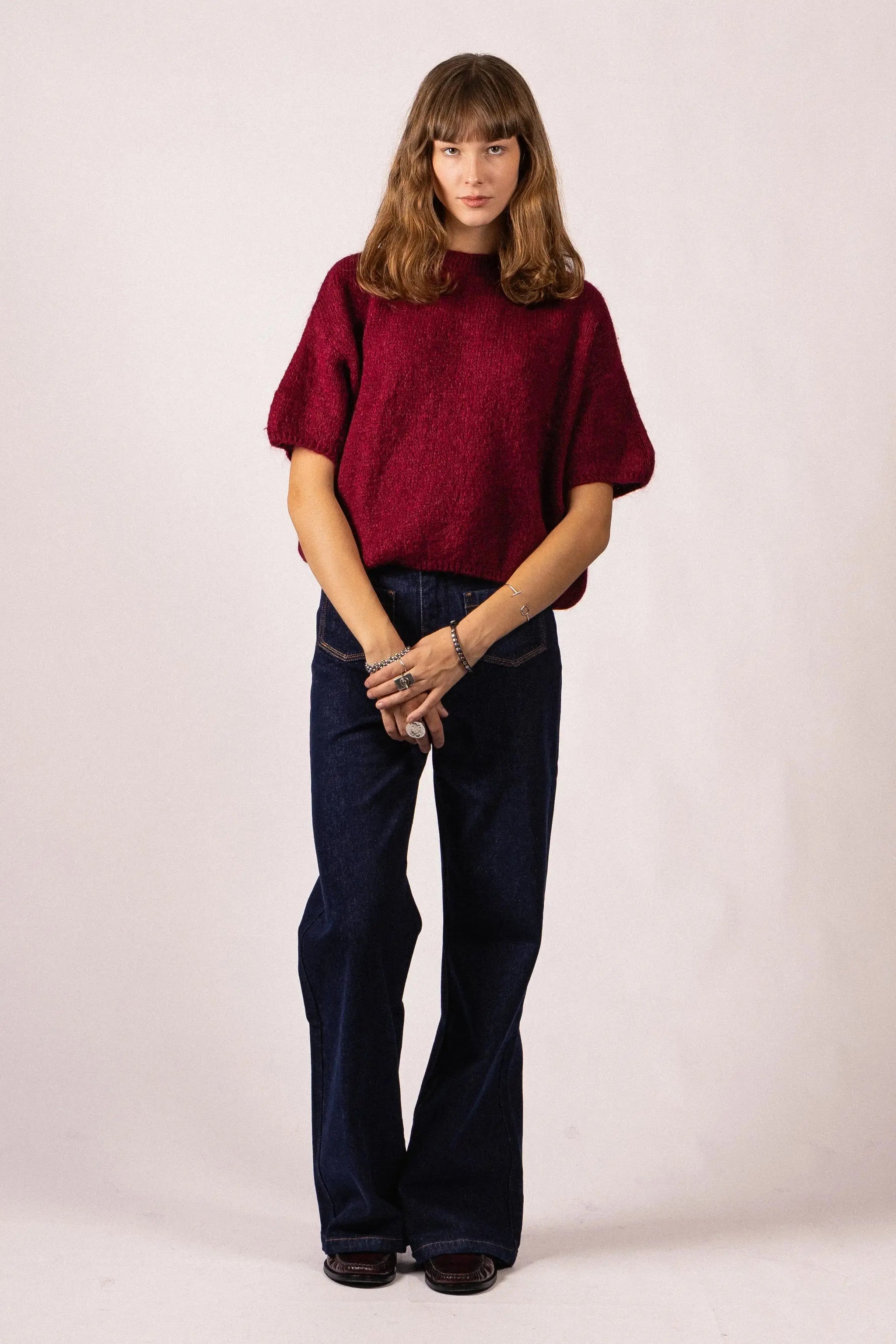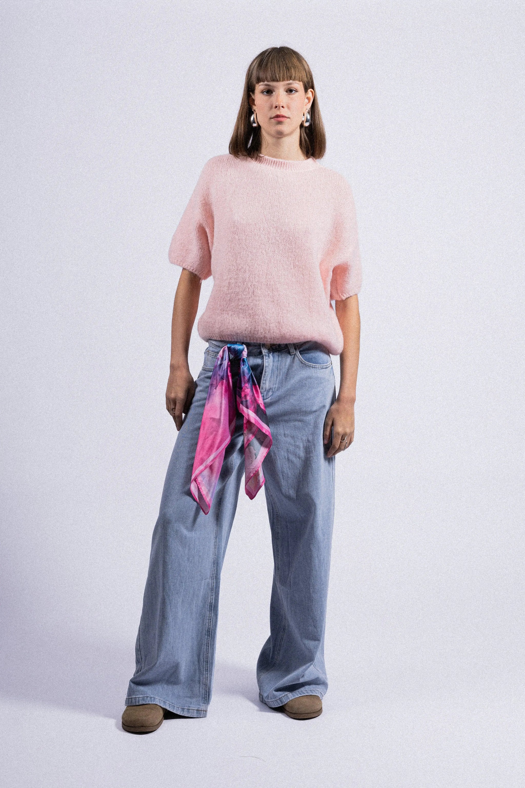 Pull doux en maille duveteuse, manches courtes légèrement ballon.