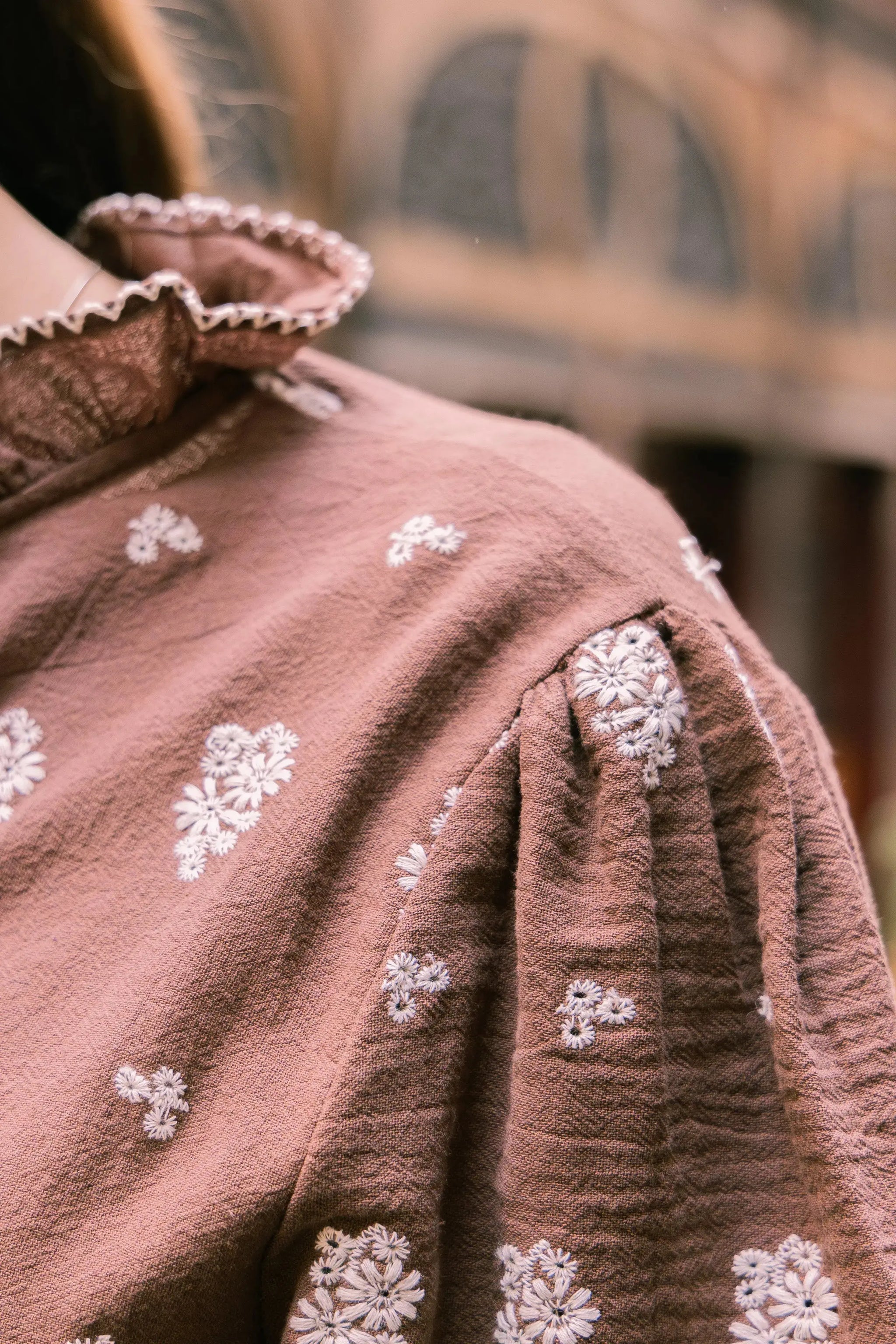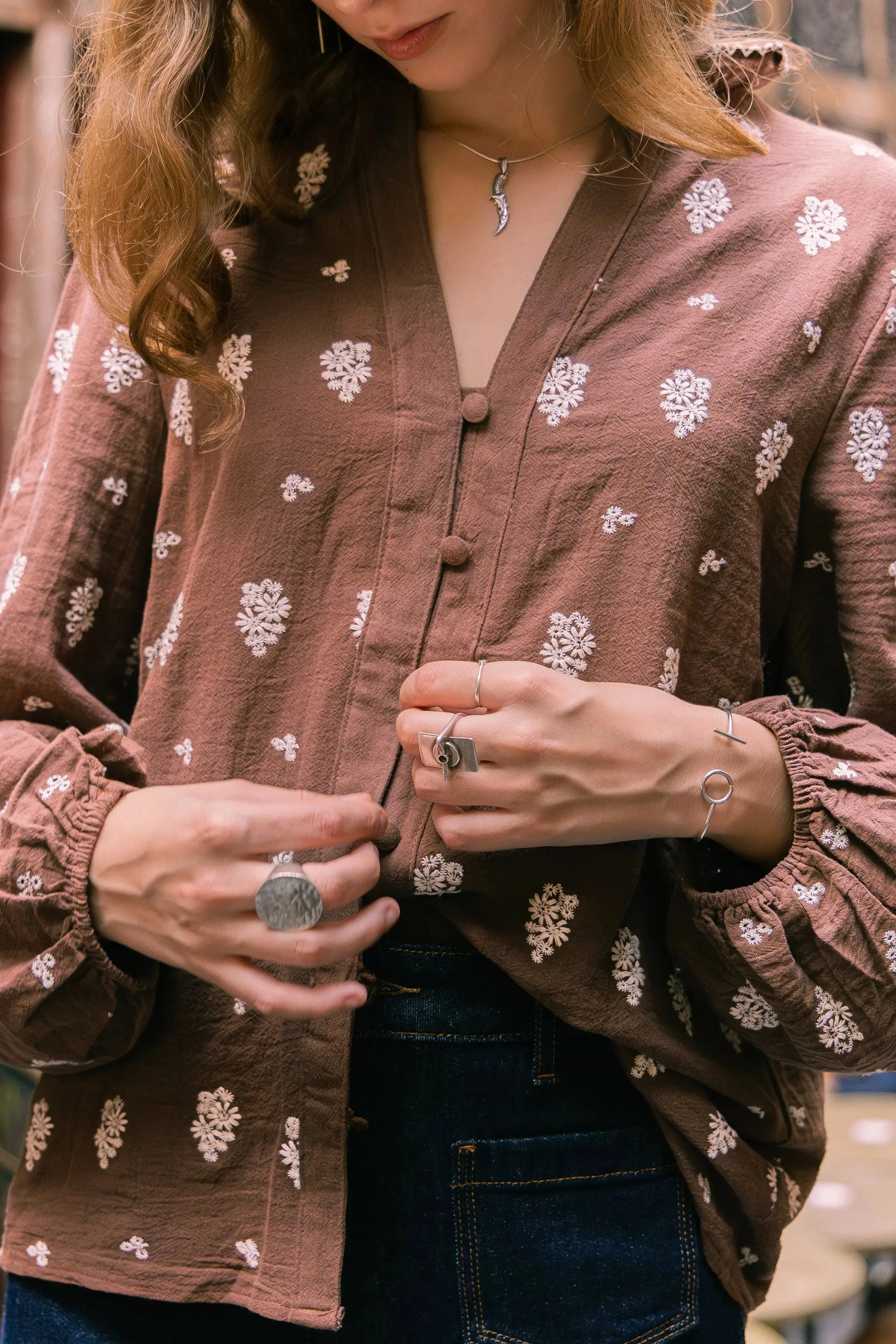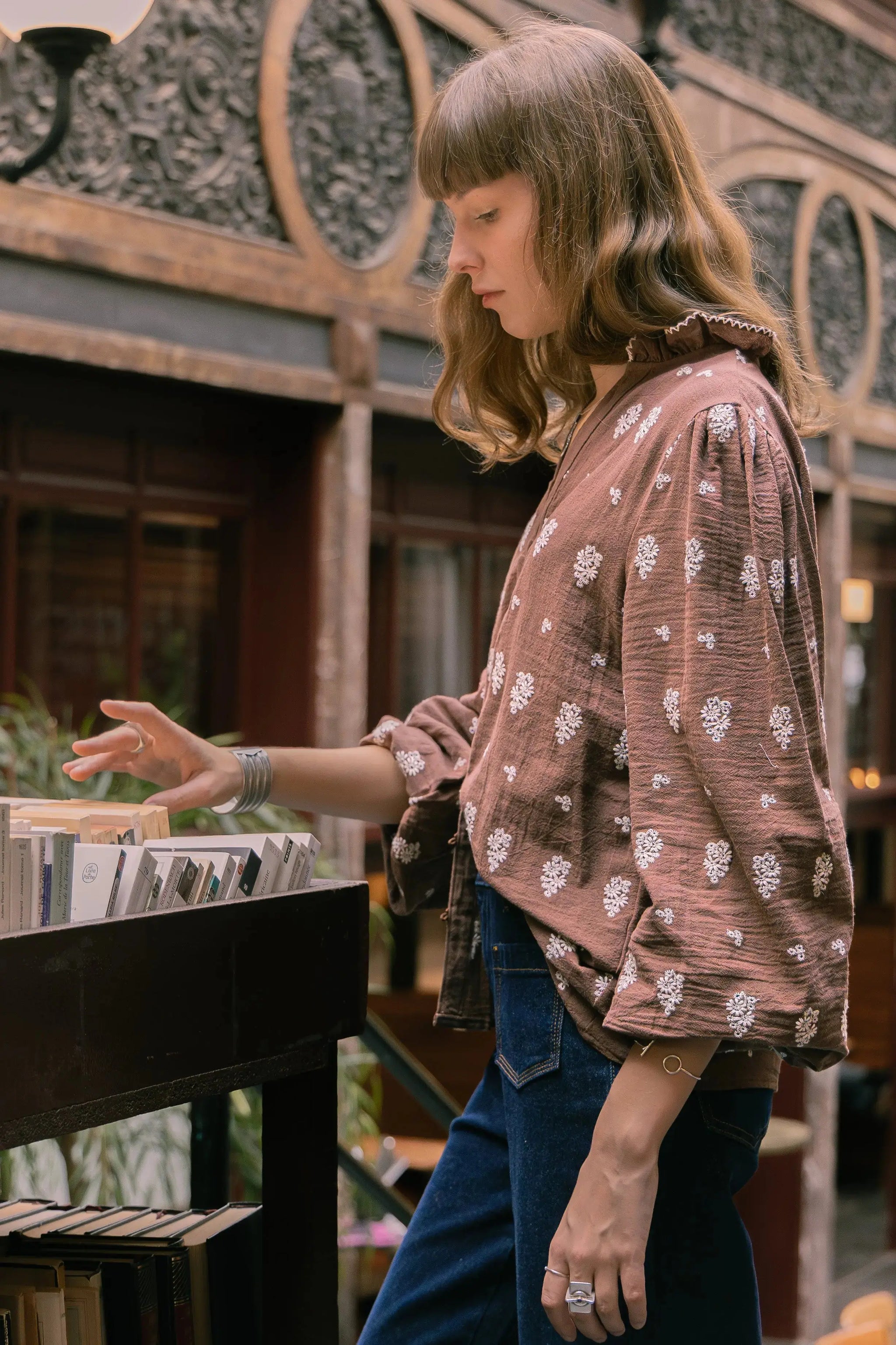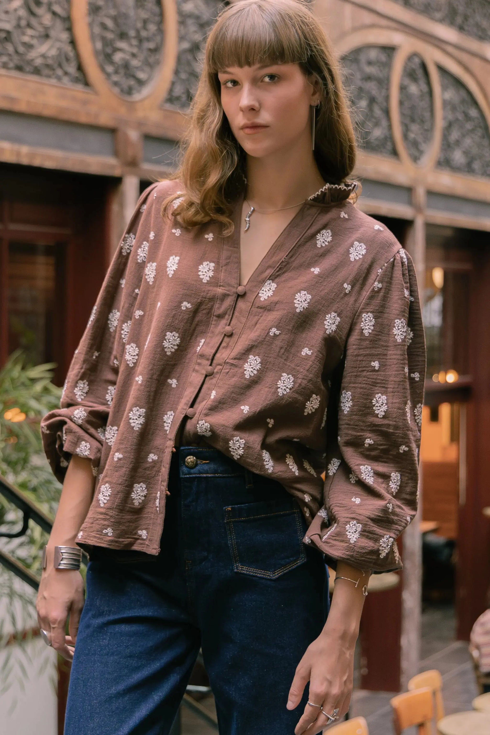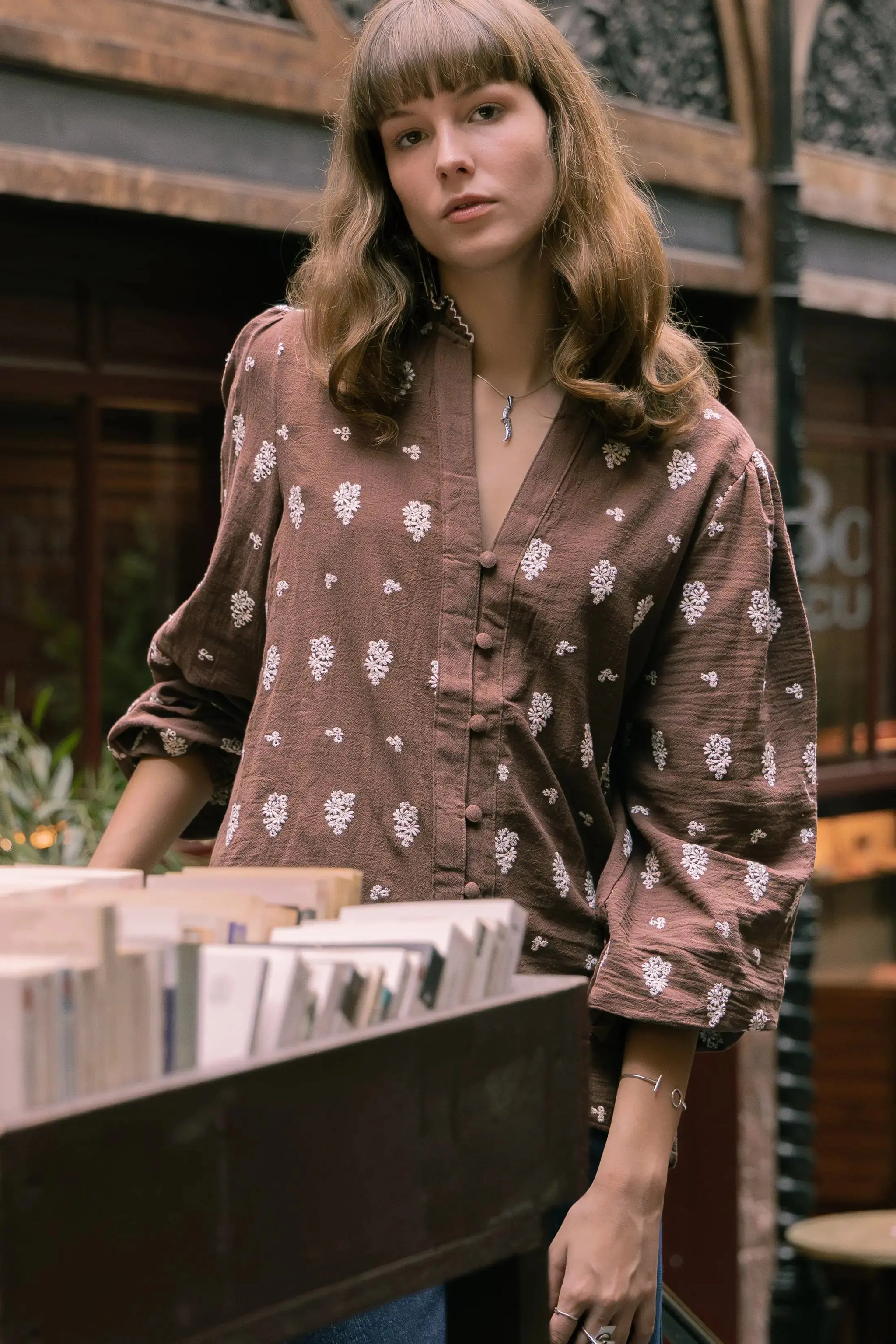 Chemise légère à motifs brodés, confectionnée en 100% coton doux. Encolure en V soulignée par une patte de boutonnage recouverte, manches longues à poignets froncés, coupe droite légèrement ample. Un modèle romantique et naturel, parfait avec un denim brut ou une jupe taille haute.