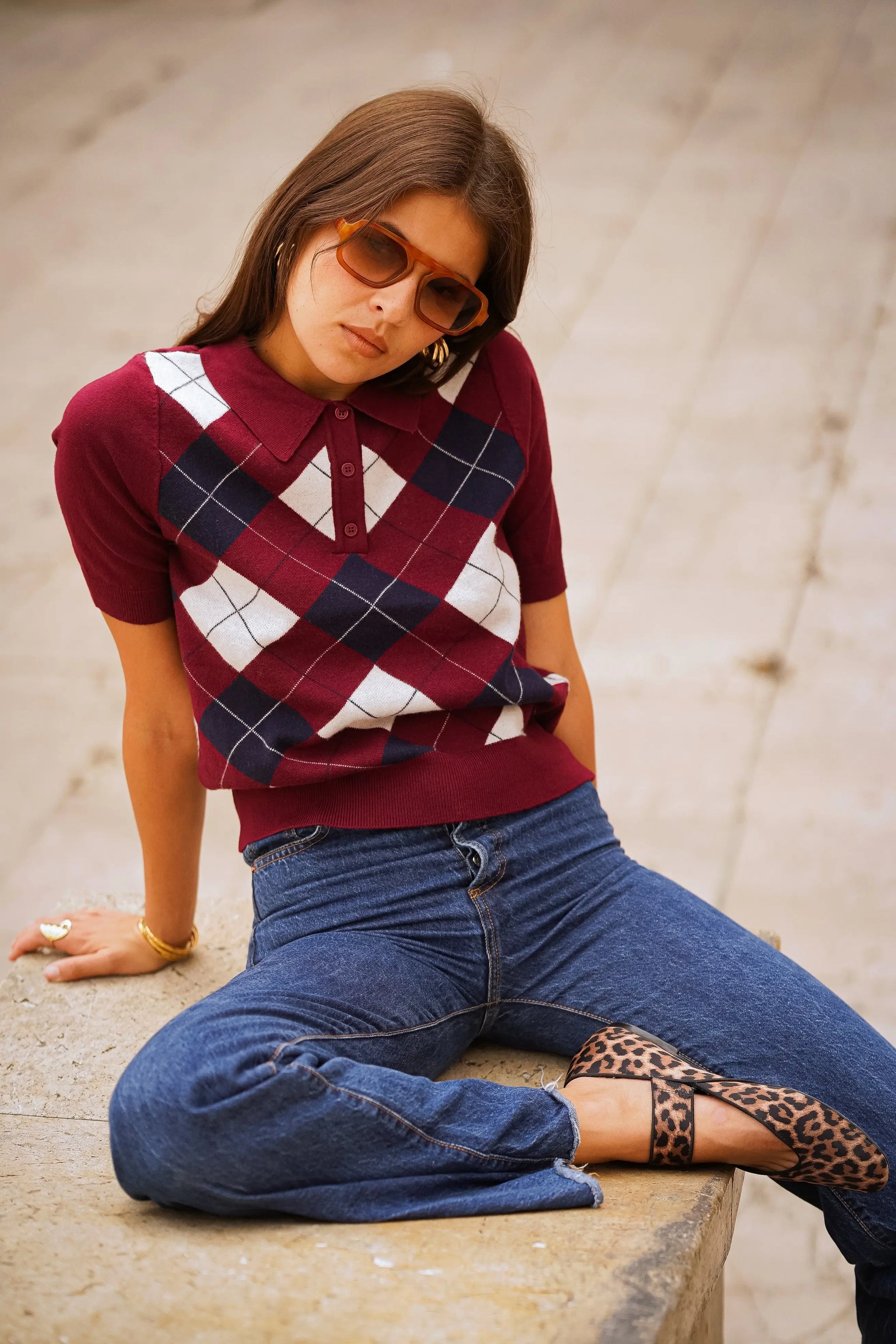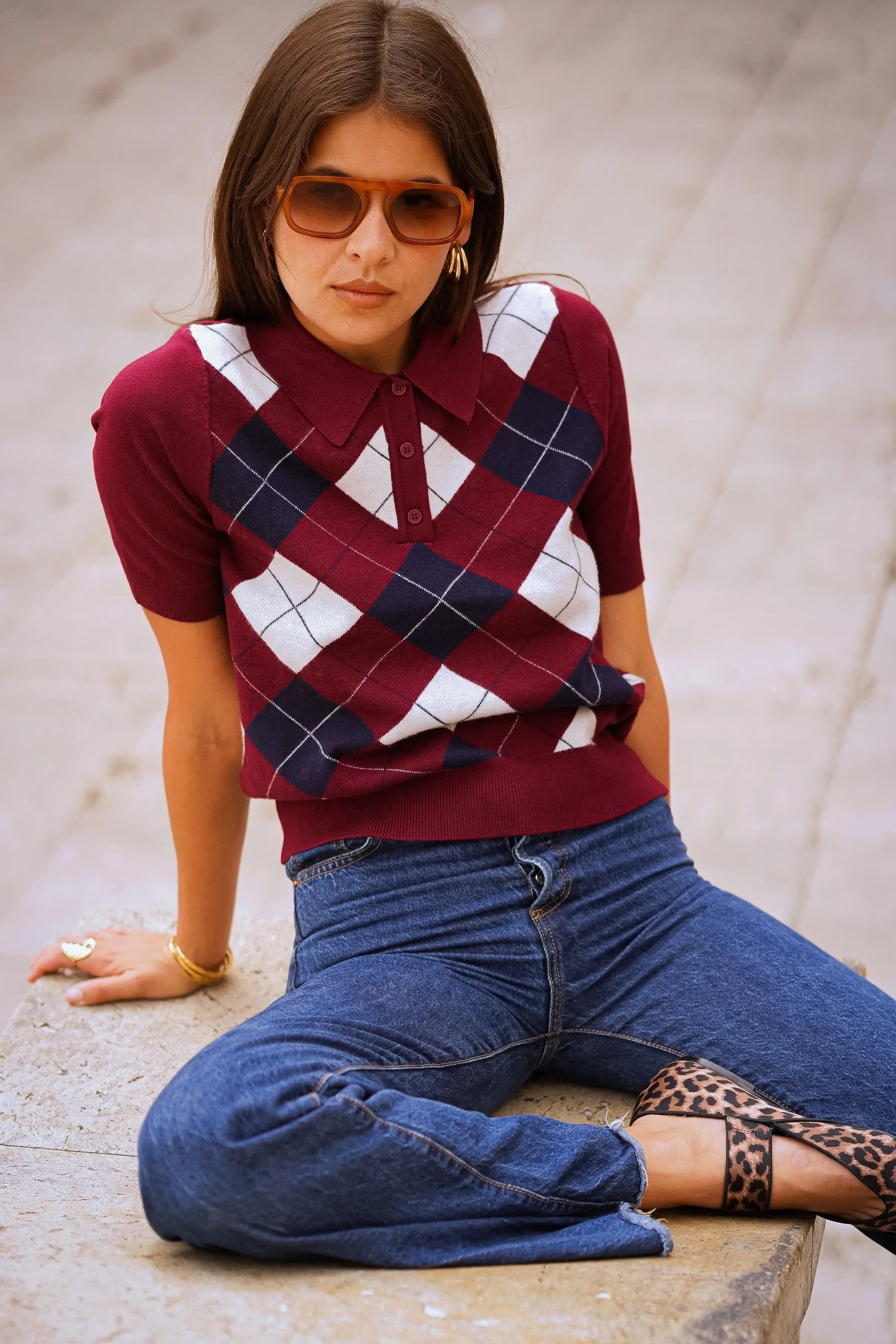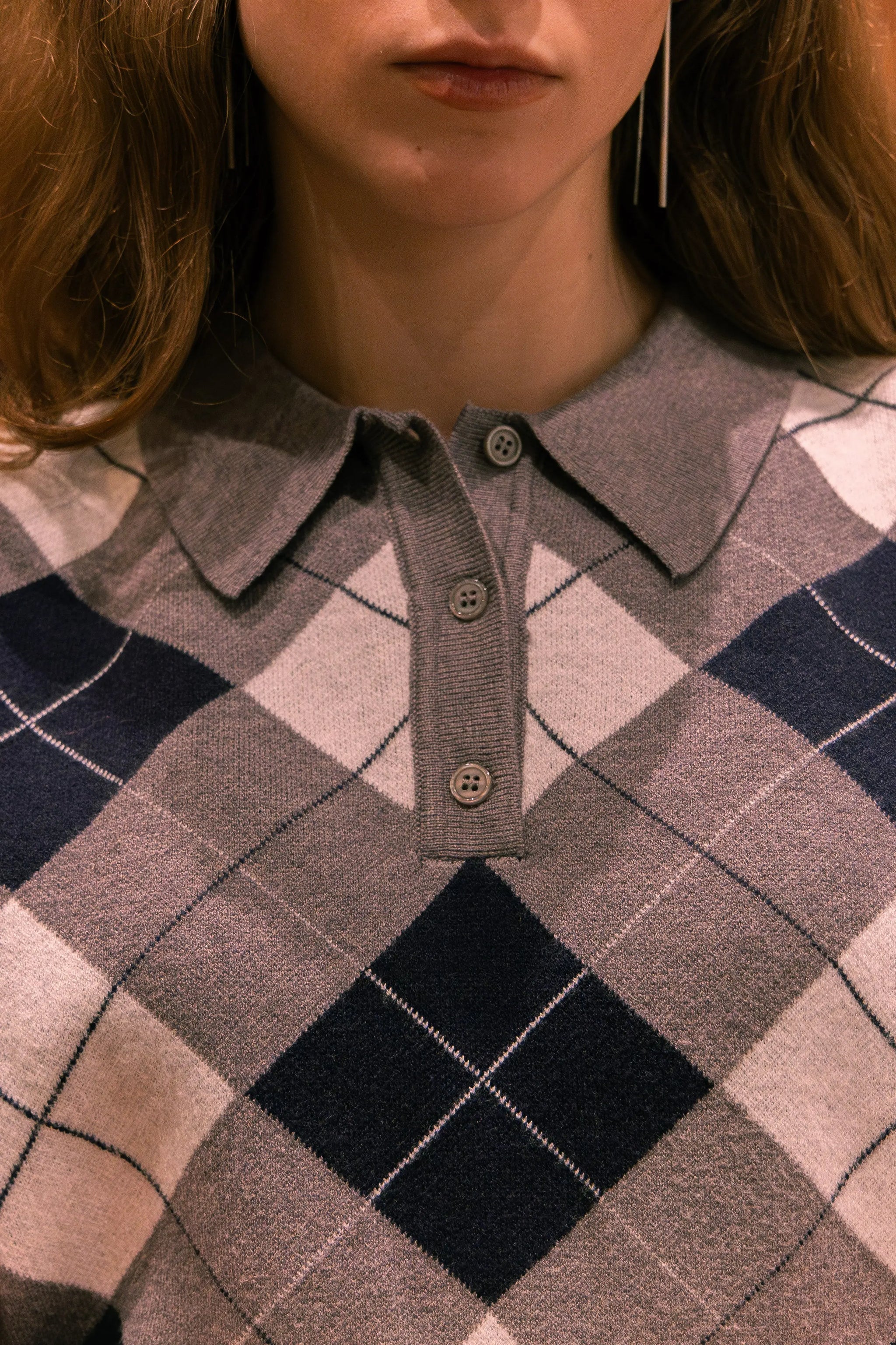 Pull sans manches à motif argyle, esprit rétro chic. Coupe courte et ajustée, col polo avec patte de boutonnage, maille fine agréable sur la peau. Idéal porté seul ou superposé sur une chemise pour un look preppy assumé. Disponible en bordeaux ou marine.