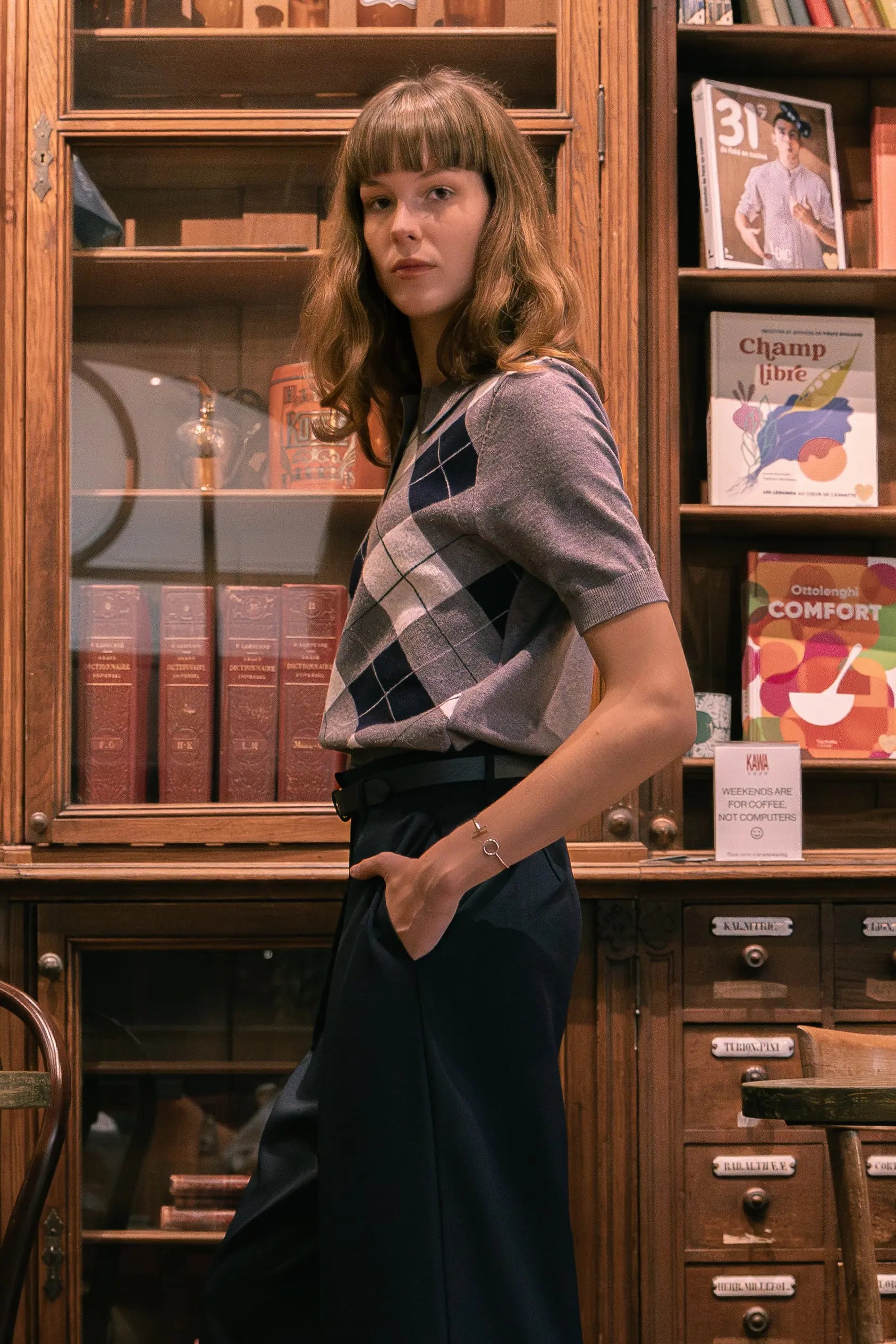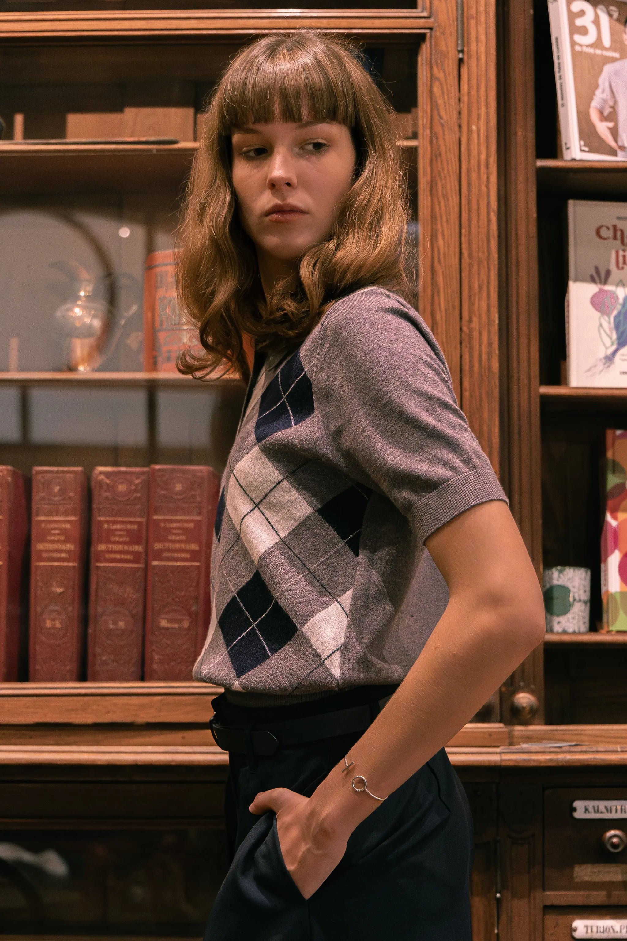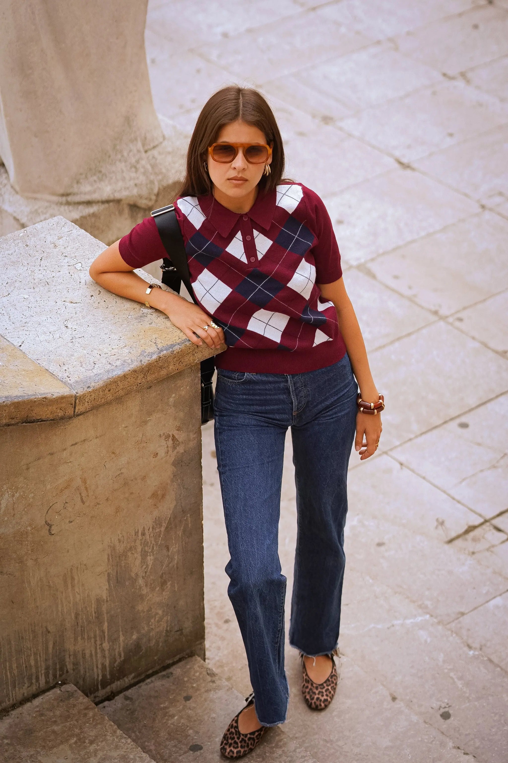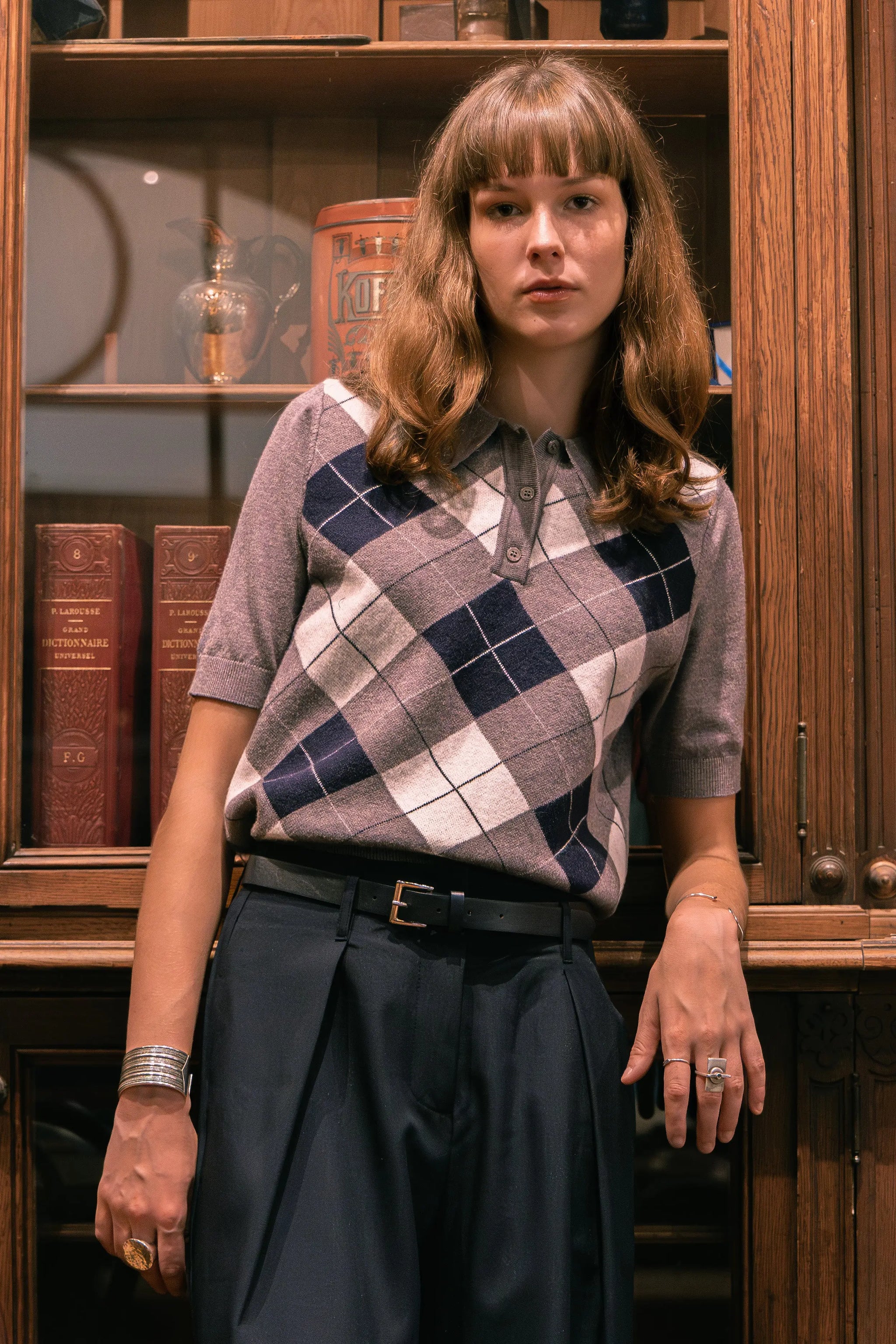 Pull sans manches à motif argyle, esprit rétro chic. Coupe courte et ajustée, col polo avec patte de boutonnage, maille fine agréable sur la peau. Idéal porté seul ou superposé sur une chemise pour un look preppy assumé. Disponible en bordeaux ou marine.