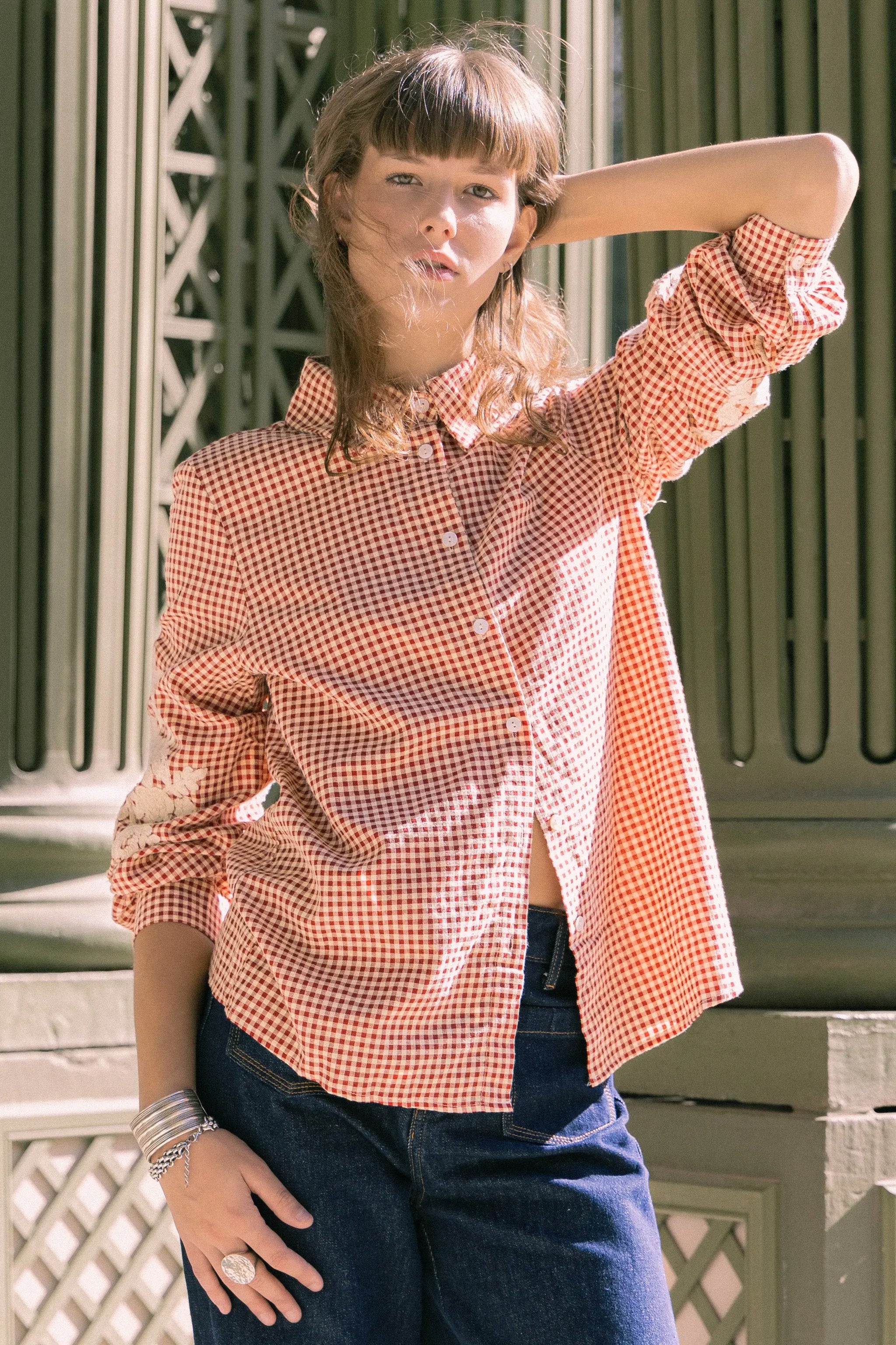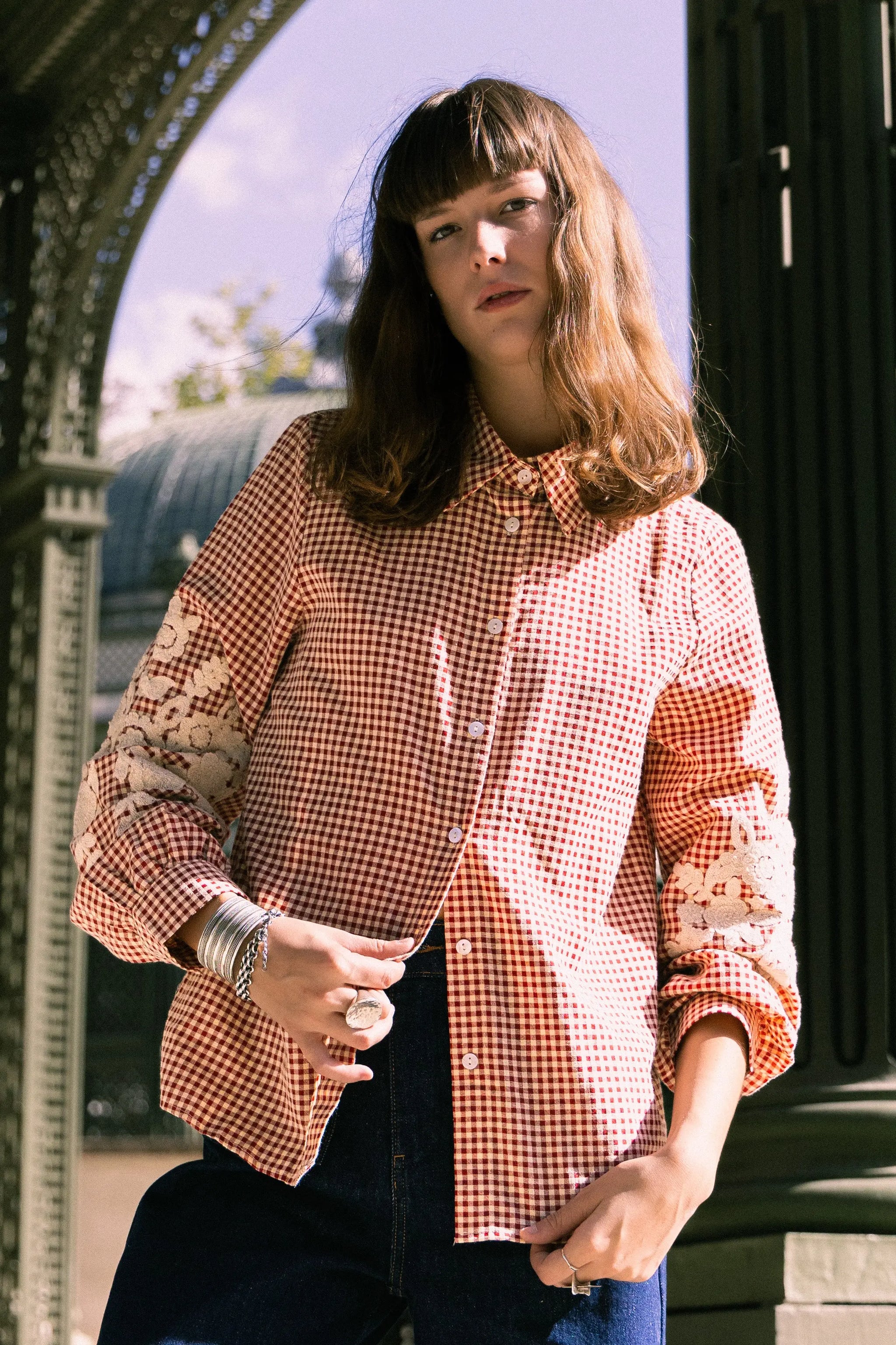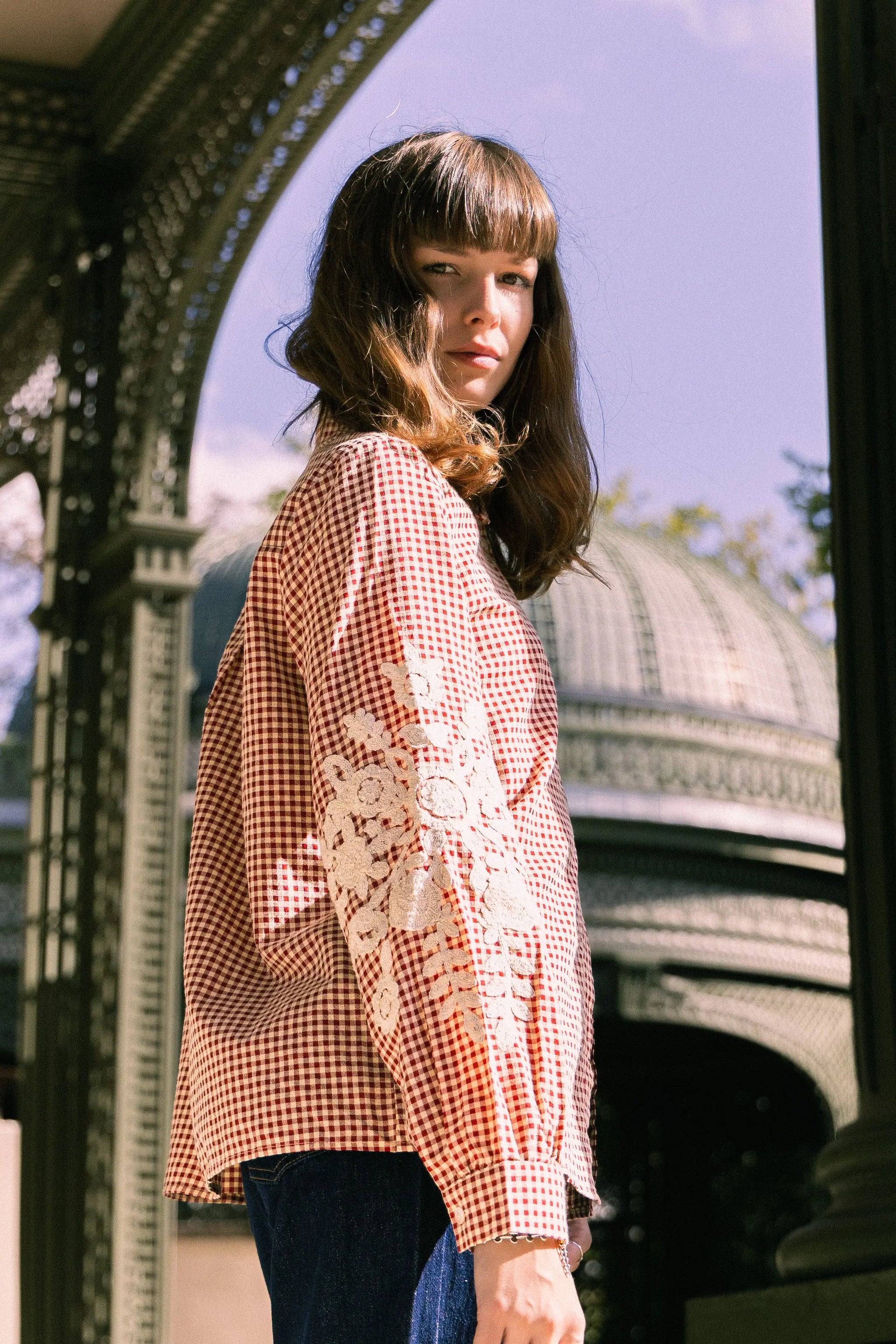 Burgundy plaid shirt with contrasting floral embroidery on the sleeves. Straight cut, classic collar and button closure. A blend of rustic and romantic style, easy to pair with raw denim.