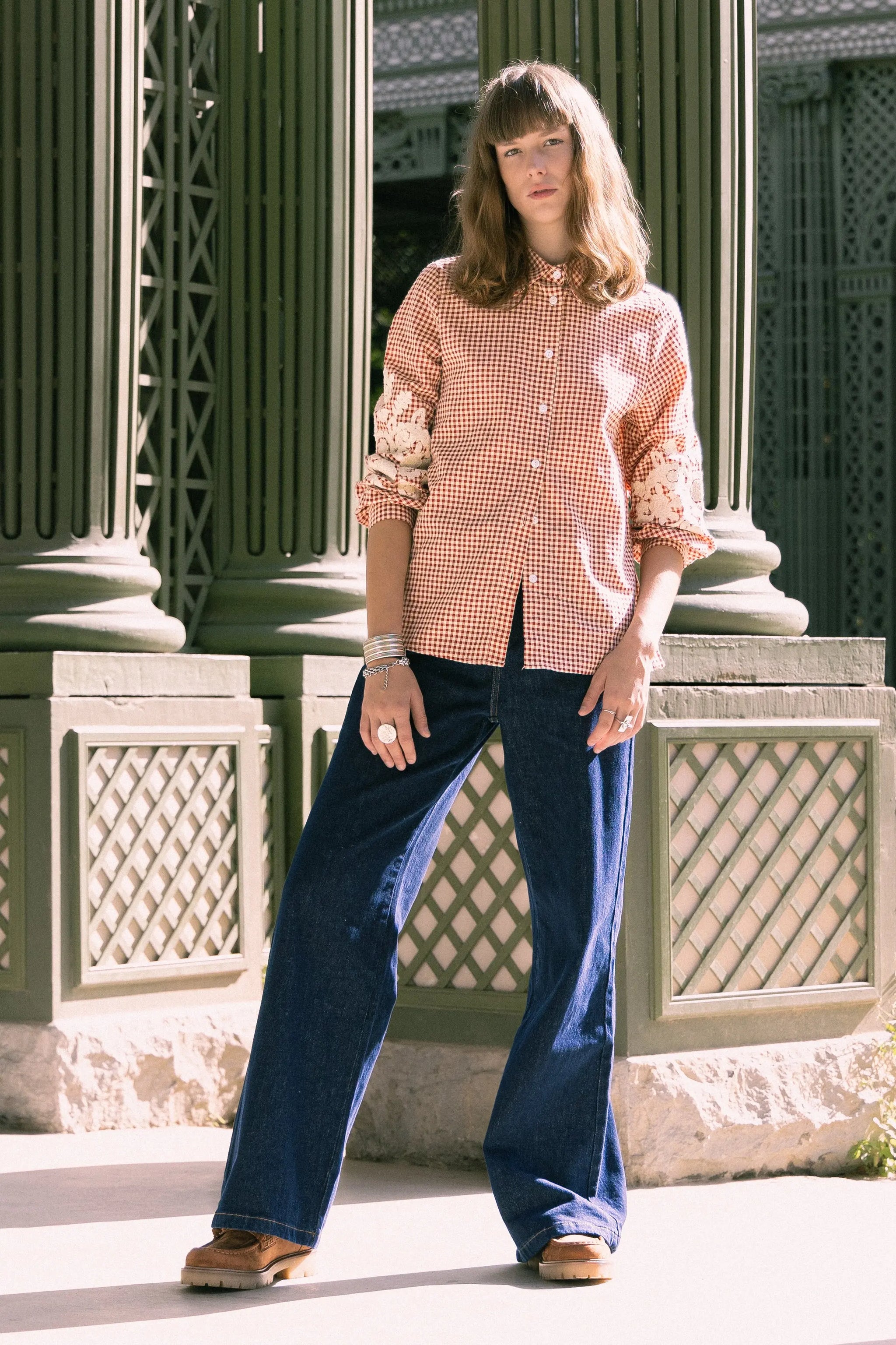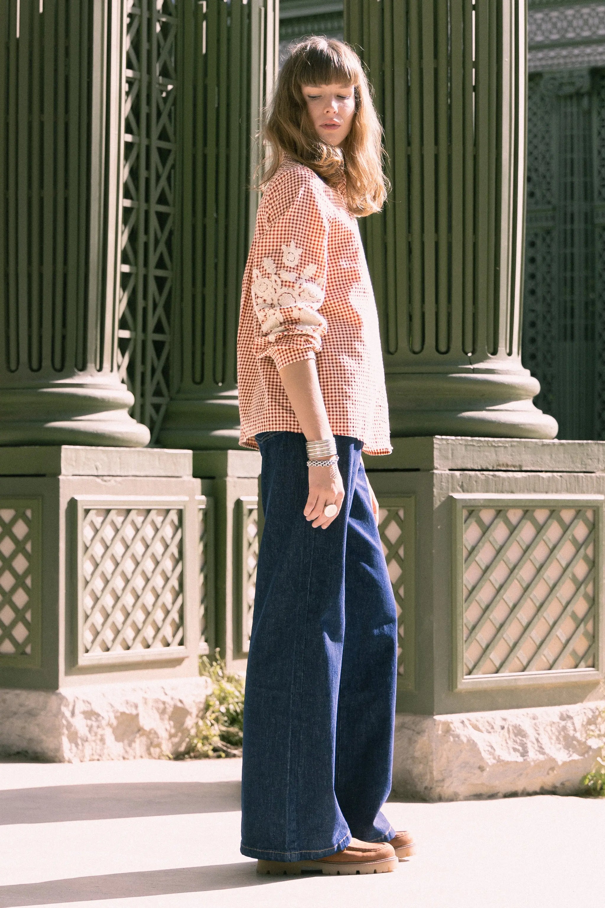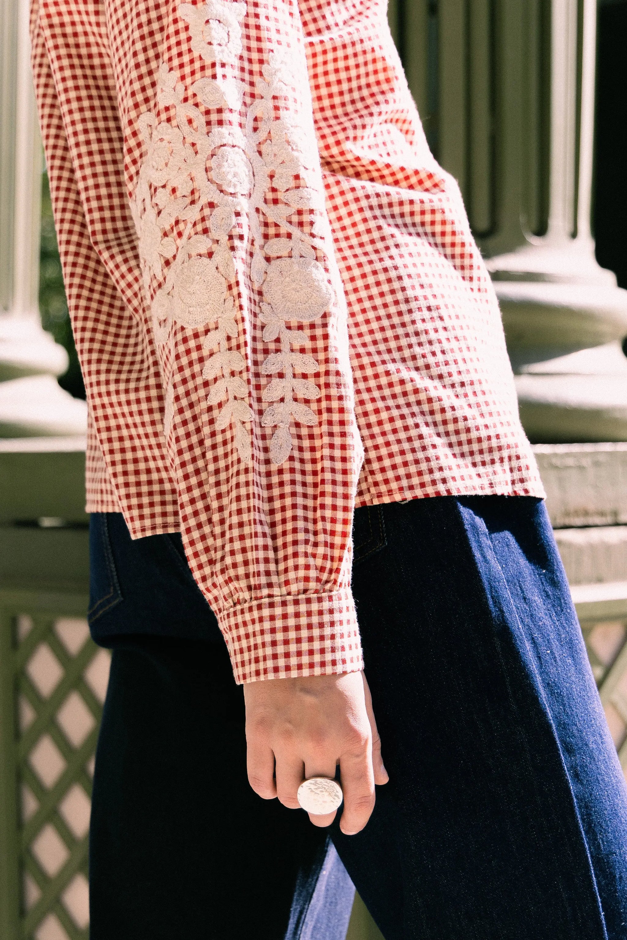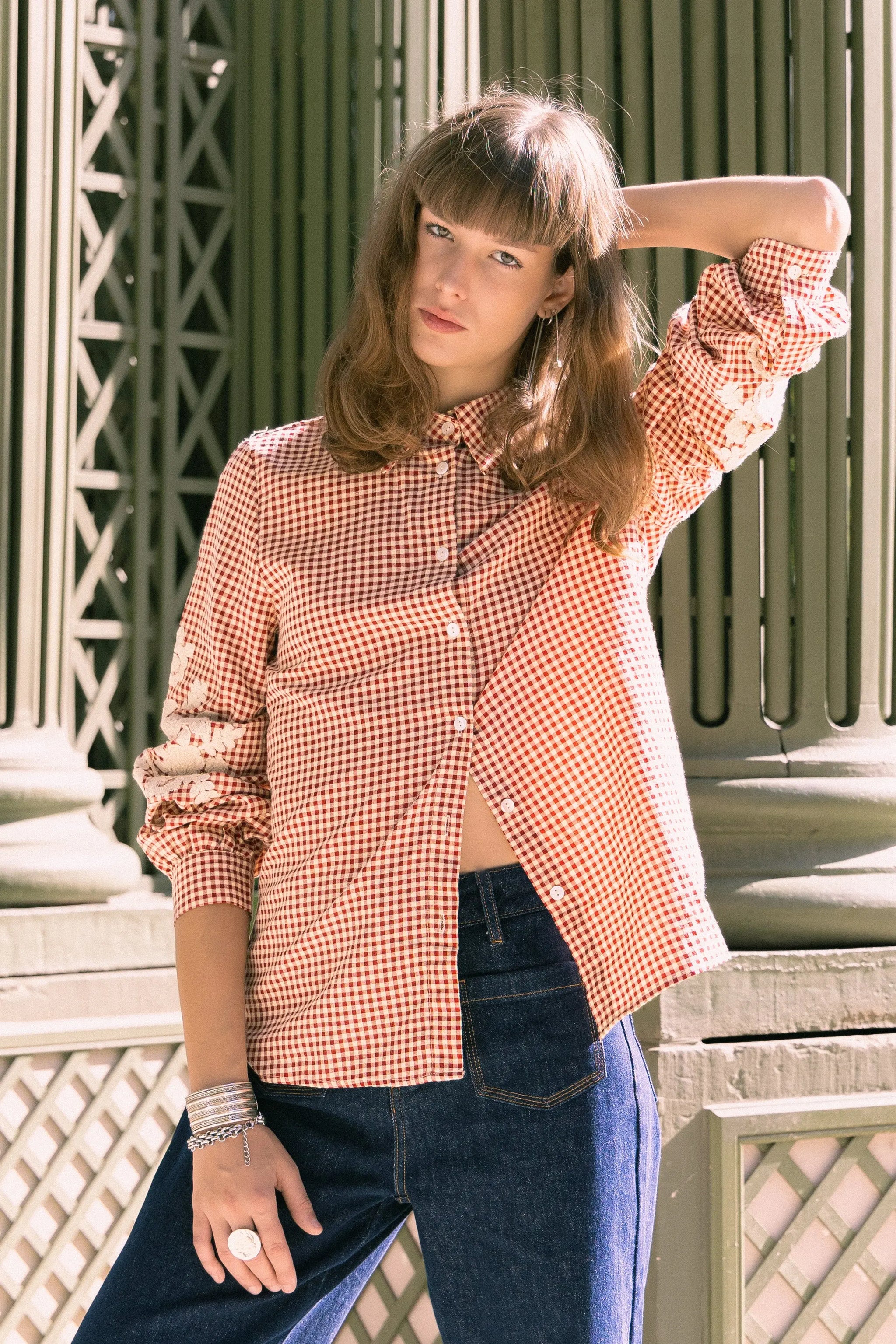 Burgundy plaid shirt with contrasting floral embroidery on the sleeves. Straight cut, classic collar and button closure. A blend of rustic and romantic style, easy to pair with raw denim.
