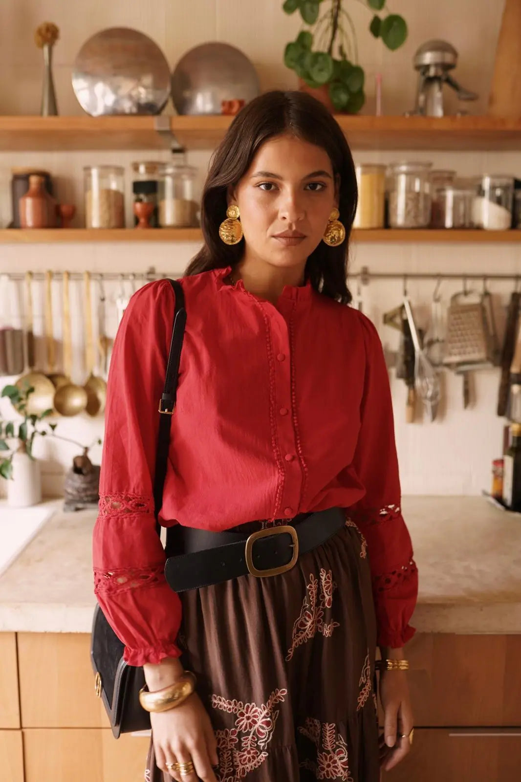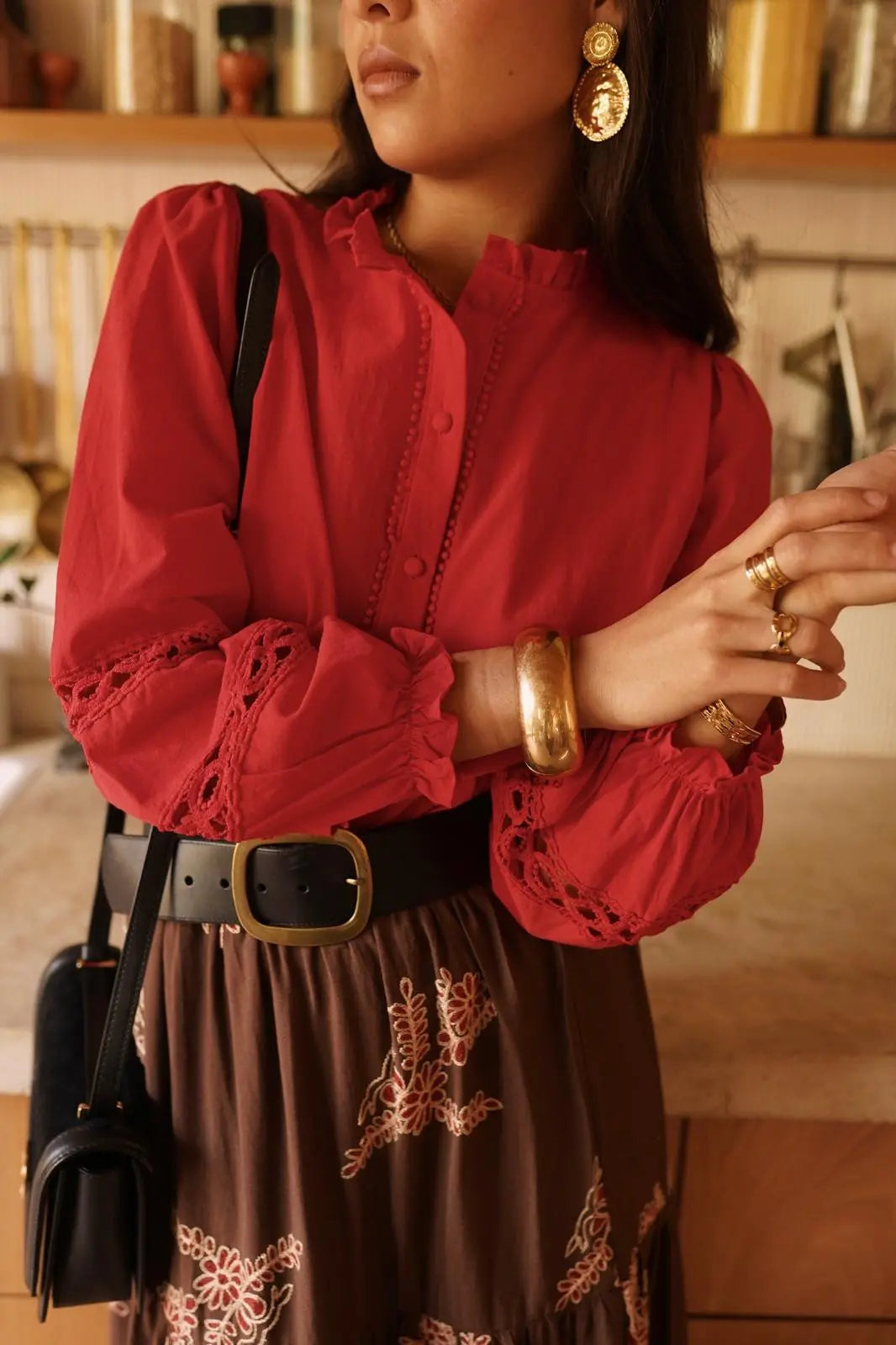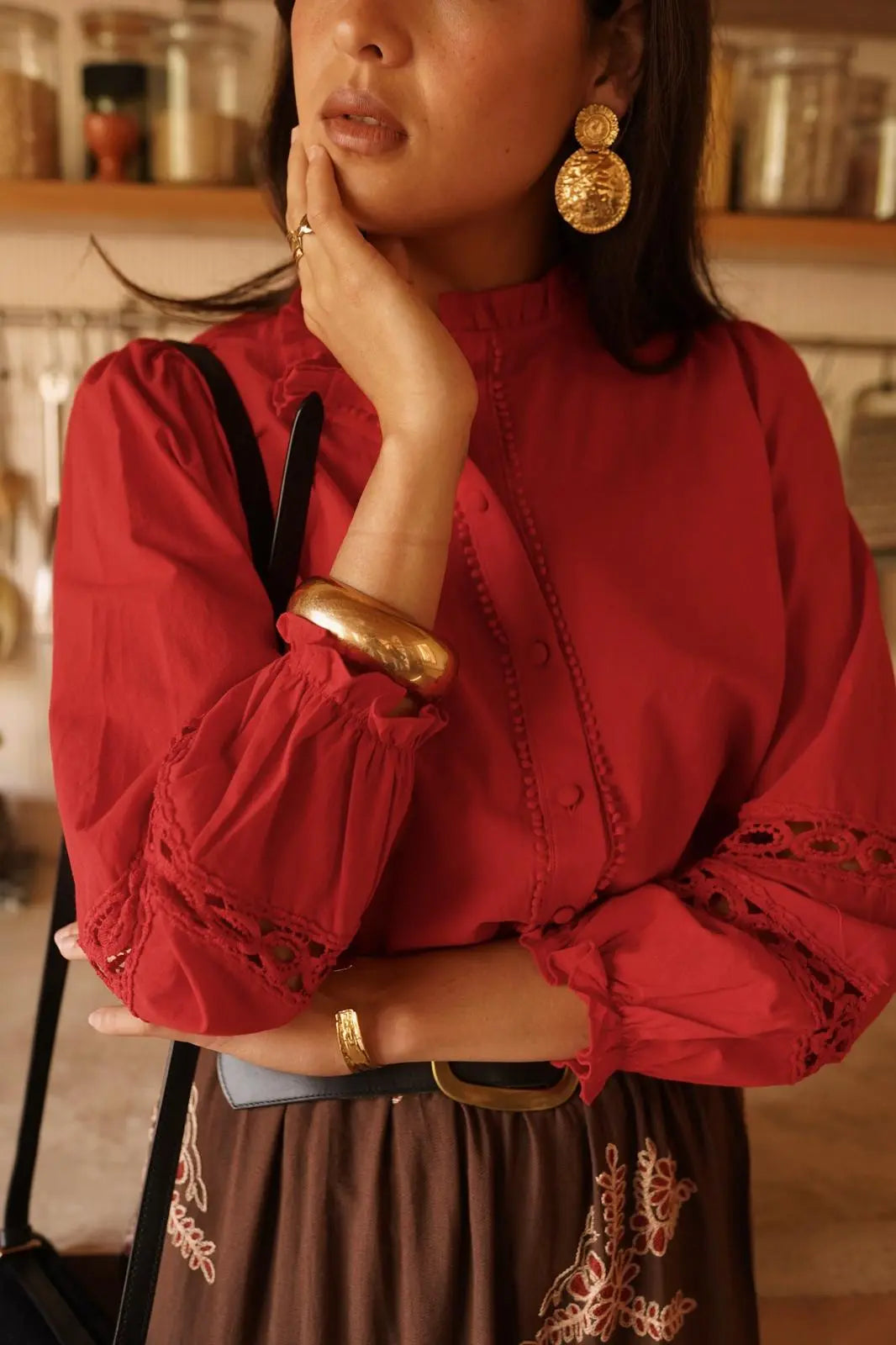 Raspberry red shirt with a stand-up collar. Openwork embroidery details on the sleeves and a row of tone-on-tone covered buttons on the front. Gathered cuffs and delicate finishes. Wear tucked into a skirt or high-waisted pants.