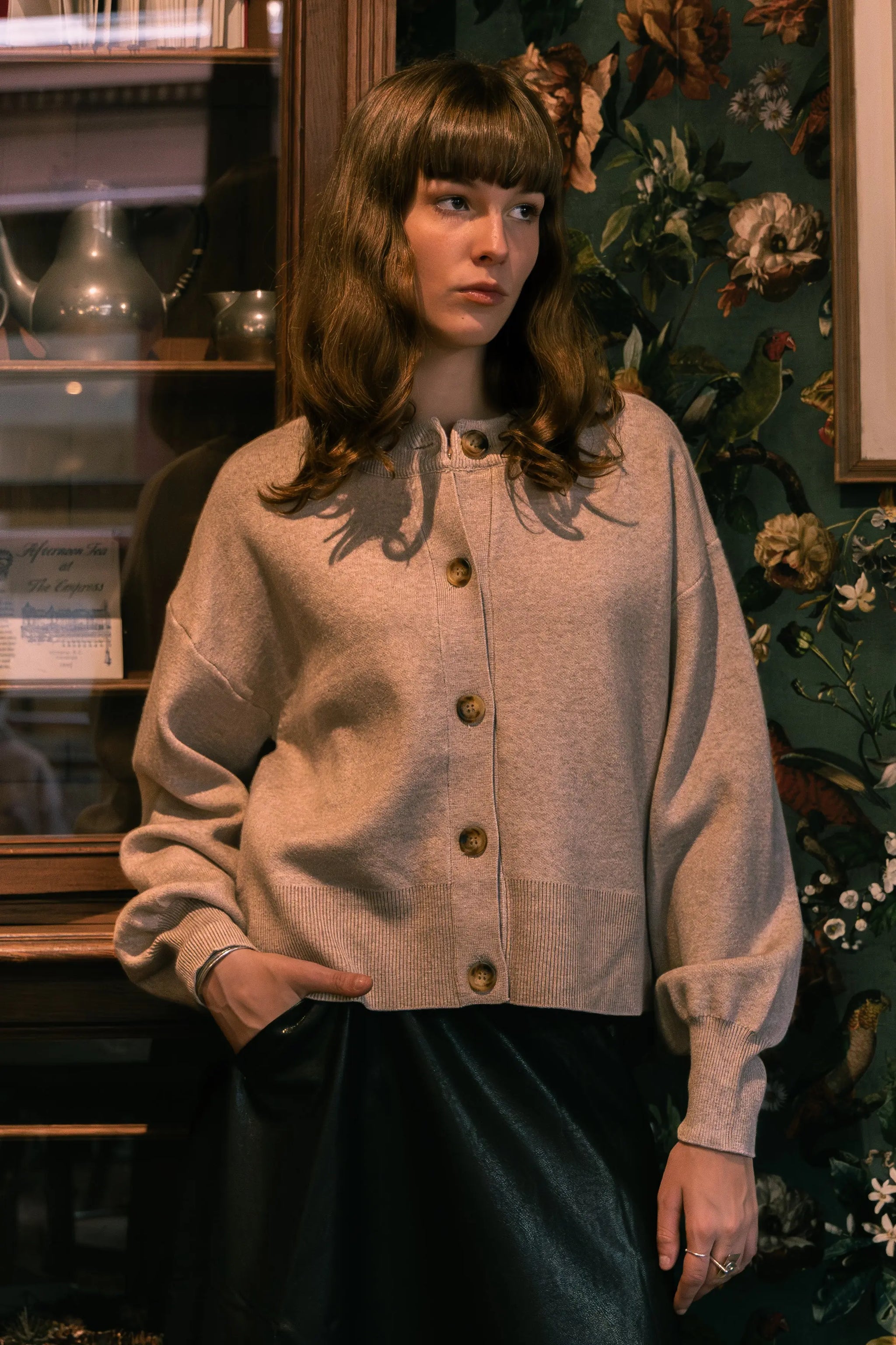Soft, textured cardigan with a round neckline, fastened with a row of pearl buttons. Straight cut, slightly loose for a natural drape, long sleeves, ribbed cuffs. It can be worn open over a t-shirt or as a lightweight knit to warm up cool days. A simple piece with that little something comforting.