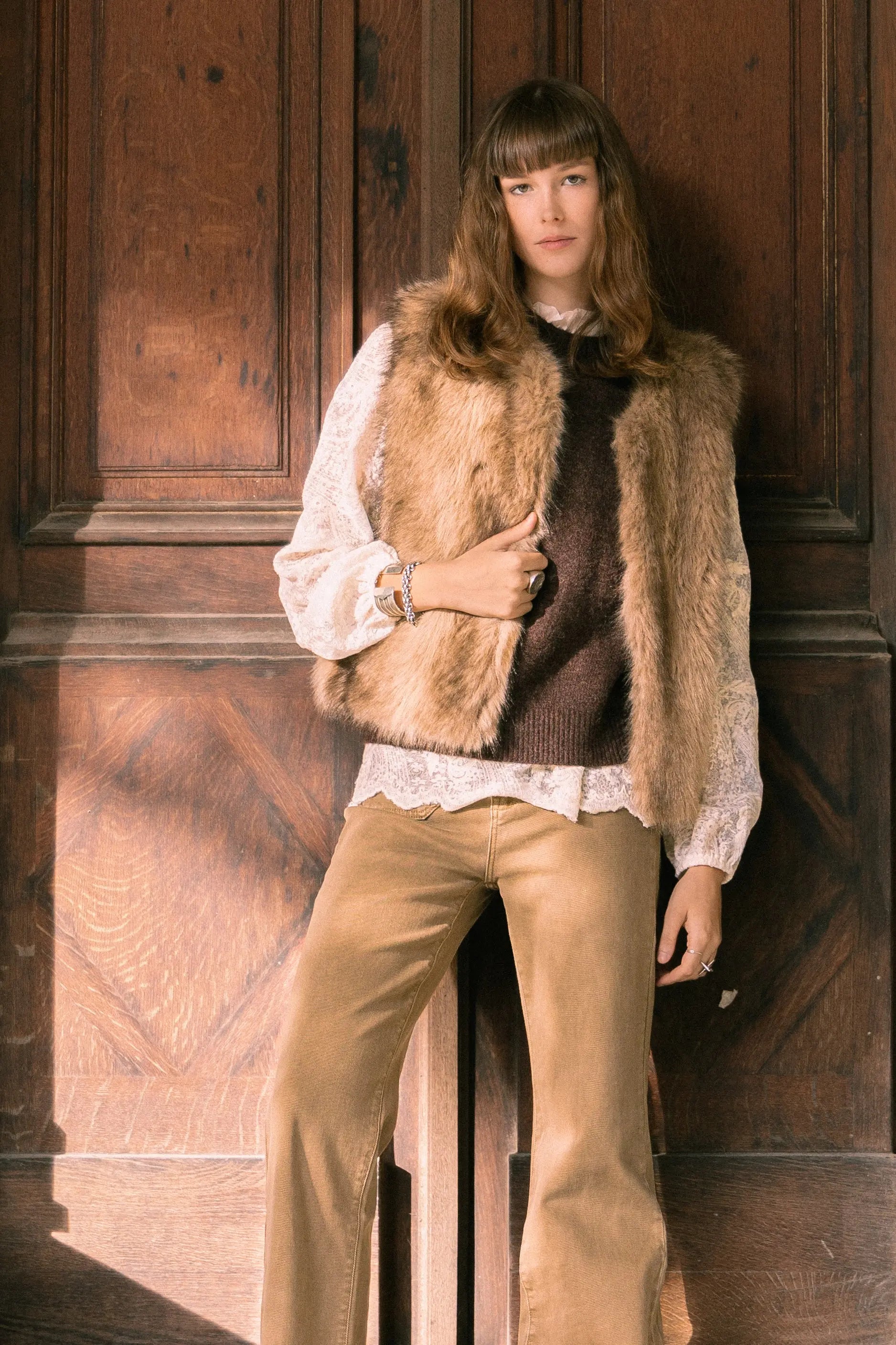 High-waisted jeans with a slightly flared, straight cut. Comfortable, structured stretch cotton fabric. Zip closure with button, belt loops, and patch pockets. An easy piece to wear every day with a shirt or fitted sweater.