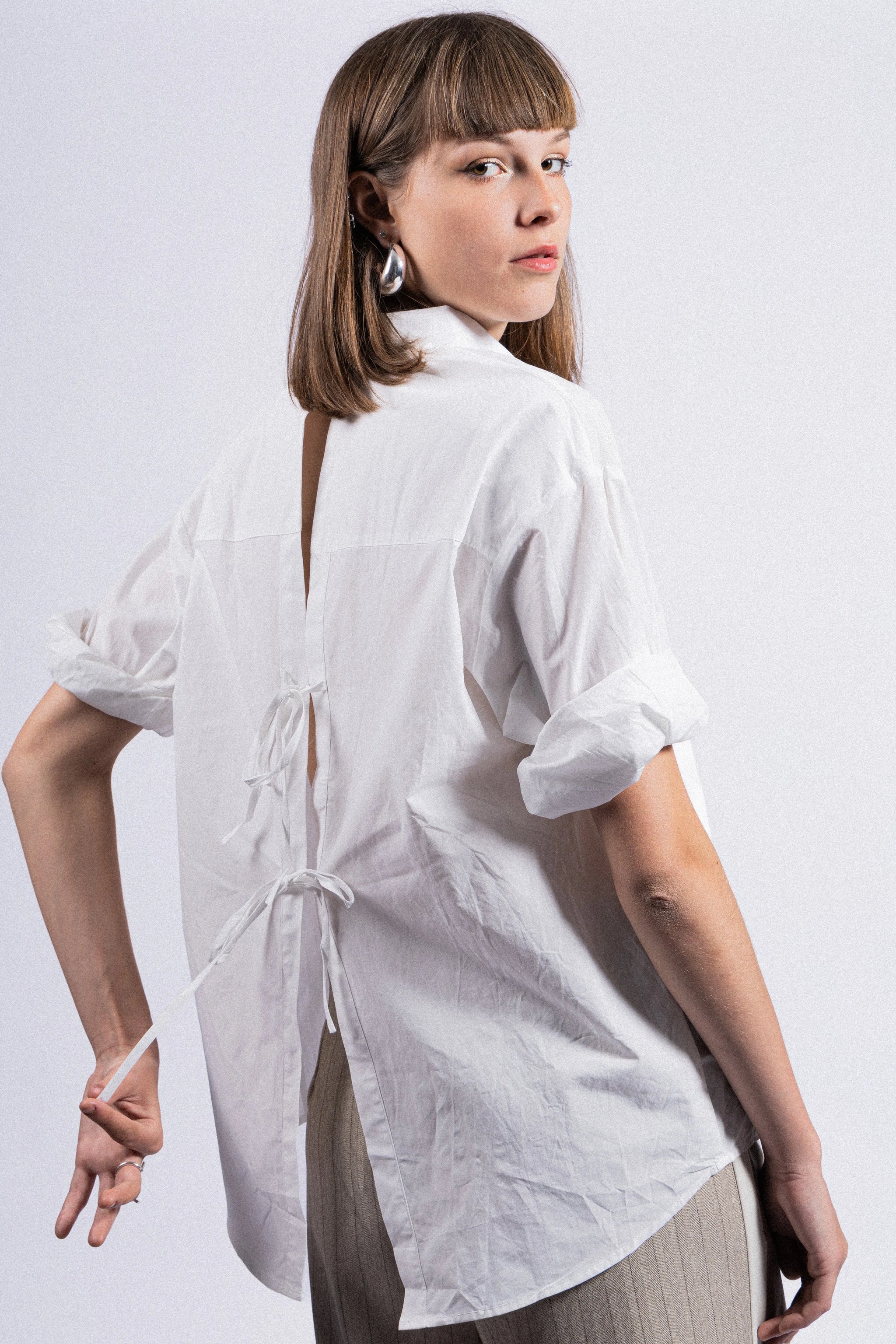 A timeless cotton blouse, updated with a sleek open back for a modern touch. Crafted from 100% cotton, it feels lightweight and comfortable all day long. Its refined design and thoughtful details make it a versatile piece, perfect for a chic yet casual look. Pair it with flowing trousers or jeans for a sophisticated look with ease.