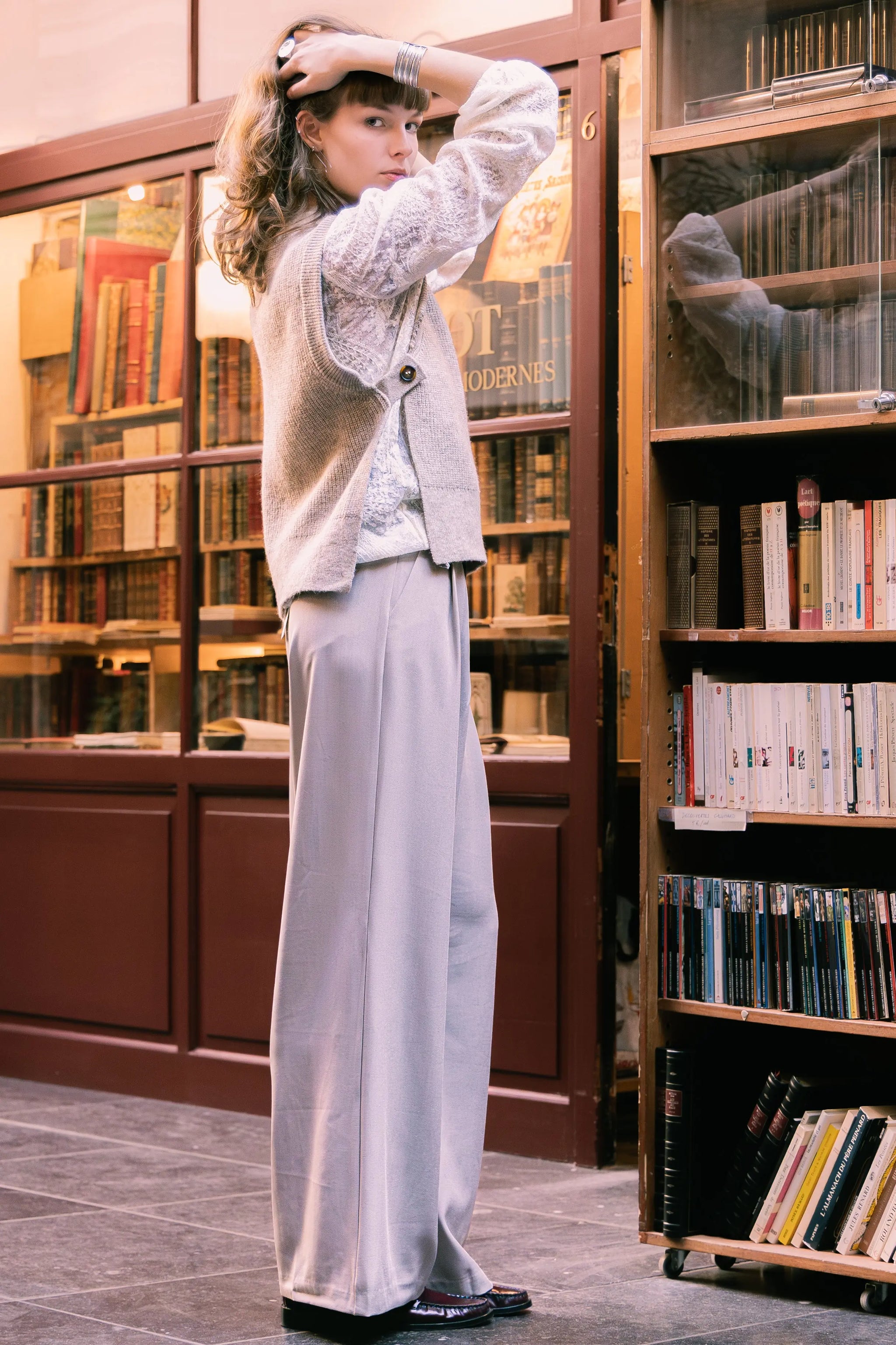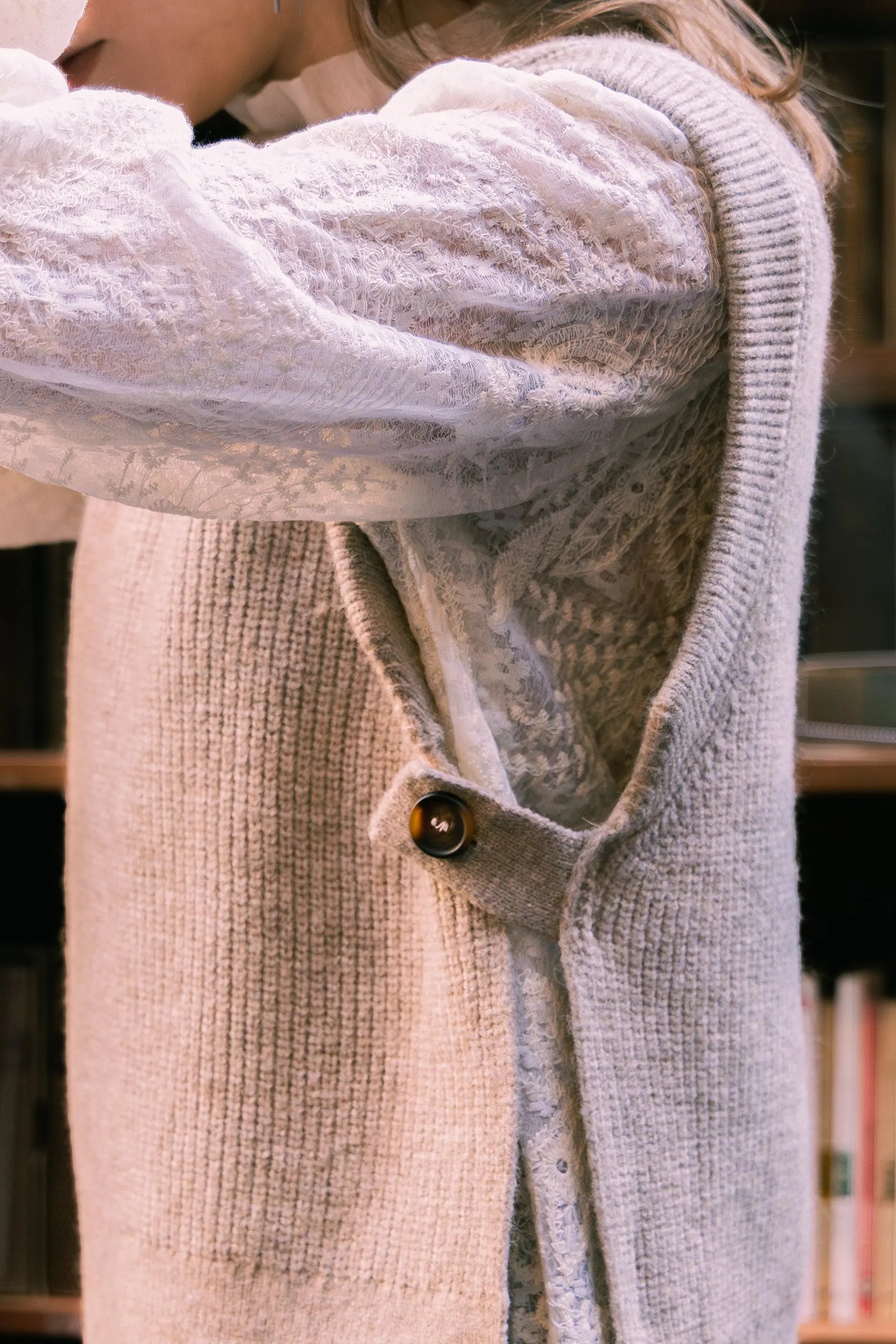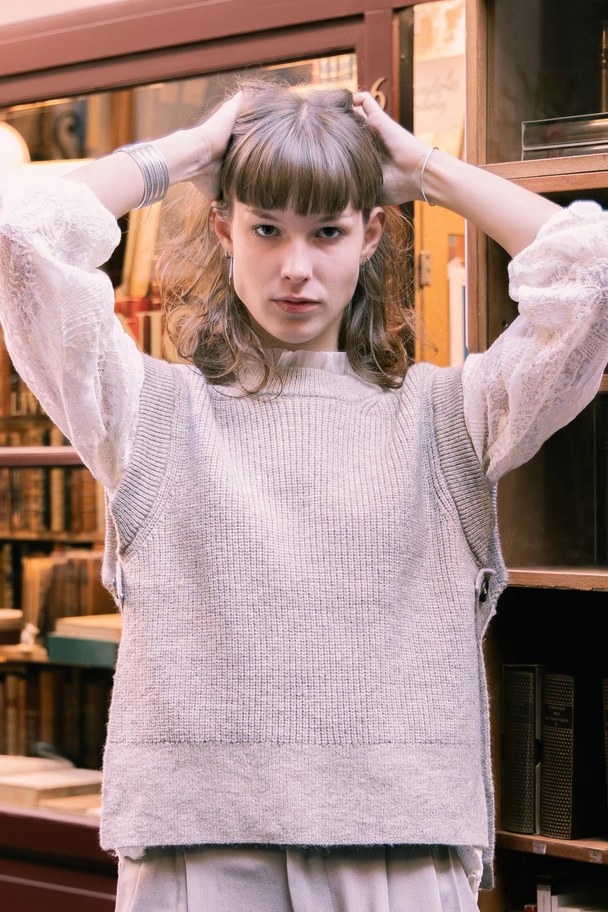 A sleeveless sweater with a straight cut and a rounded neckline, designed for fall layering. Its soft, textured knit provides the perfect contrast against a white shirt or second-skin tee. Easy to pair, it adds texture to a simple silhouette thanks to its soft structure and raw-edge finishes.