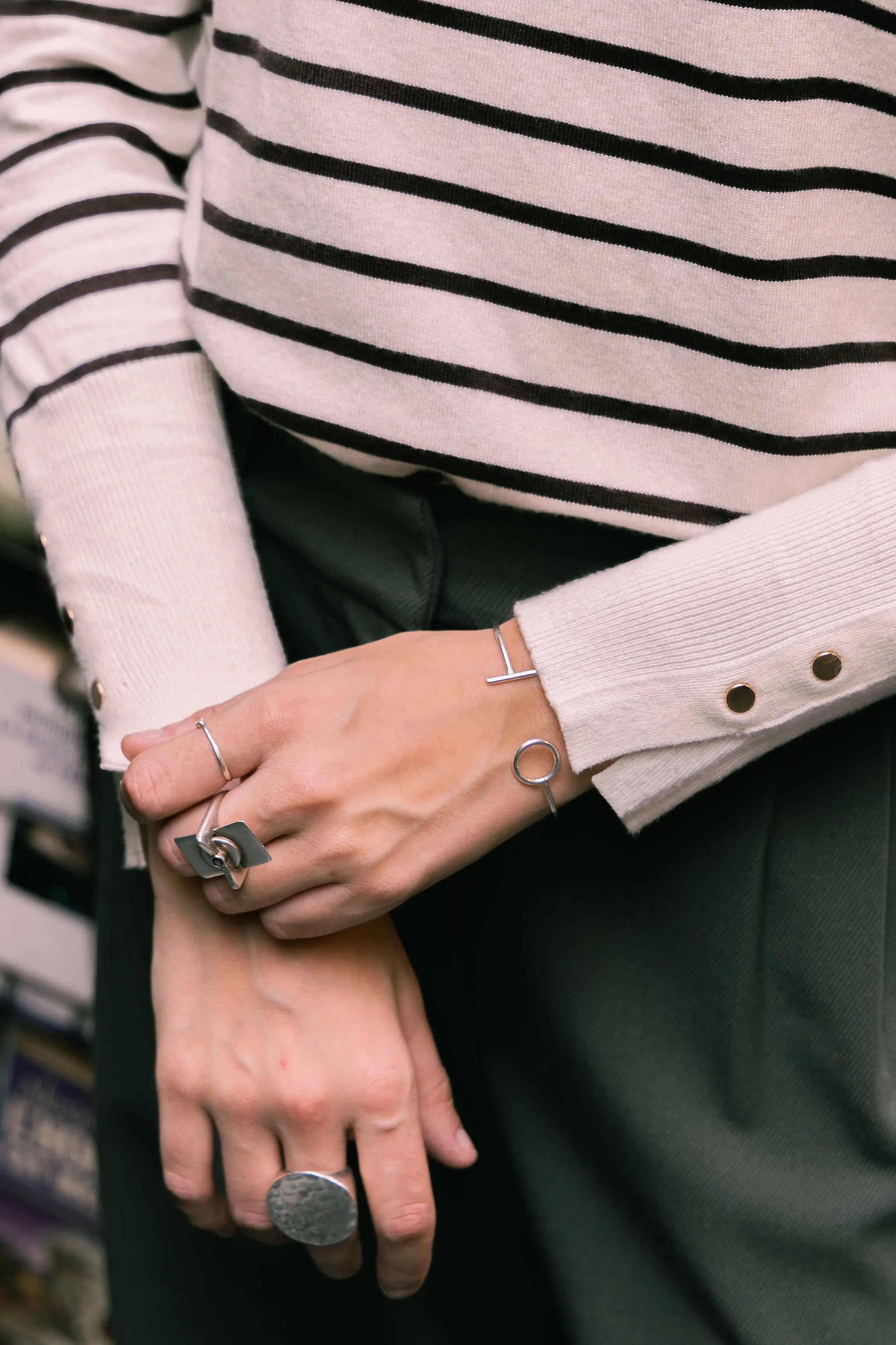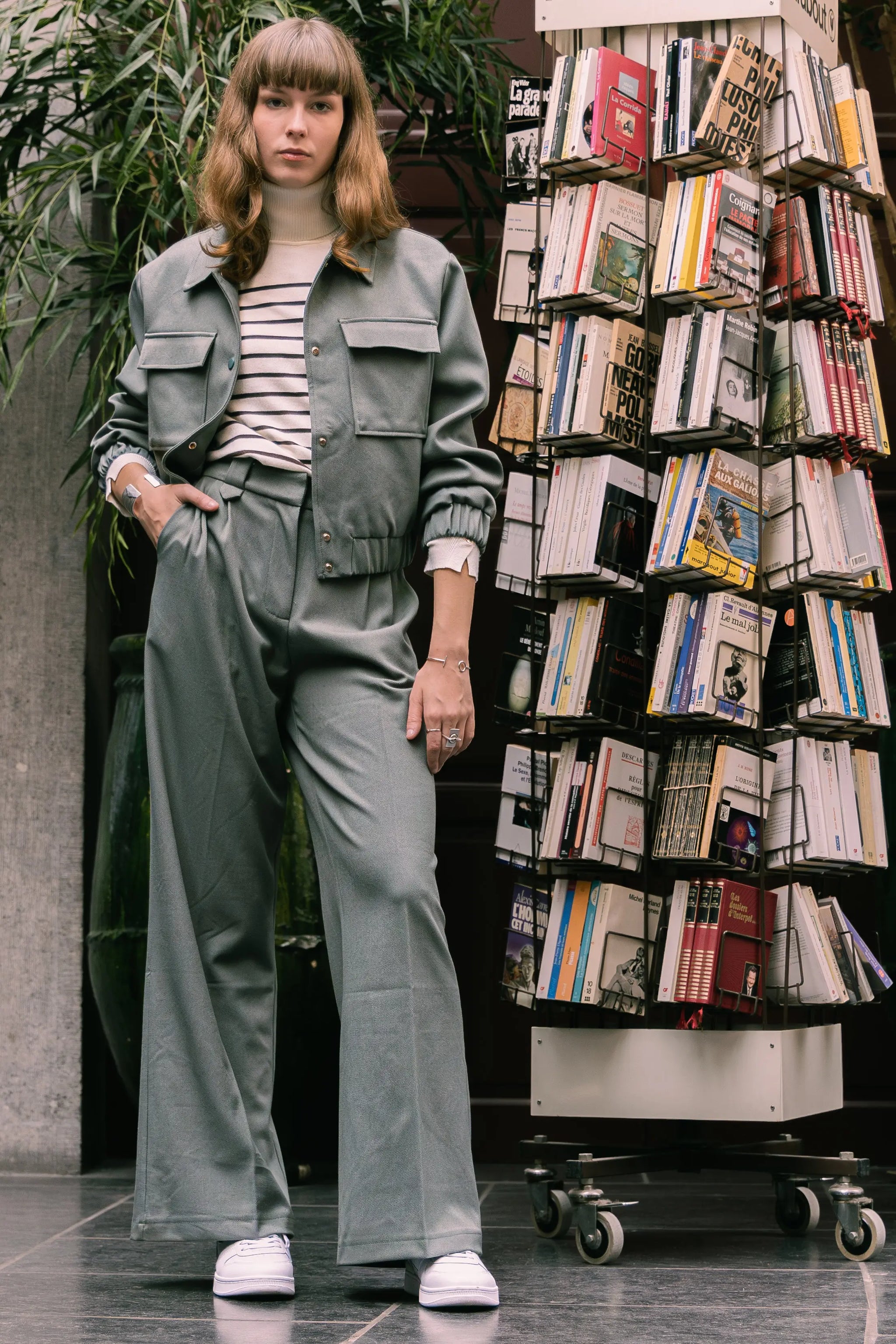 A fall wardrobe essential: the striped turtleneck sweater, subtly accented with gold buttons at the cuffs. Its soft knit hugs the body with ease, while its fine stripes give it a timeless charm. Wear tucked into high-waisted pants or over a flowing skirt for a look that's both understated and refined.