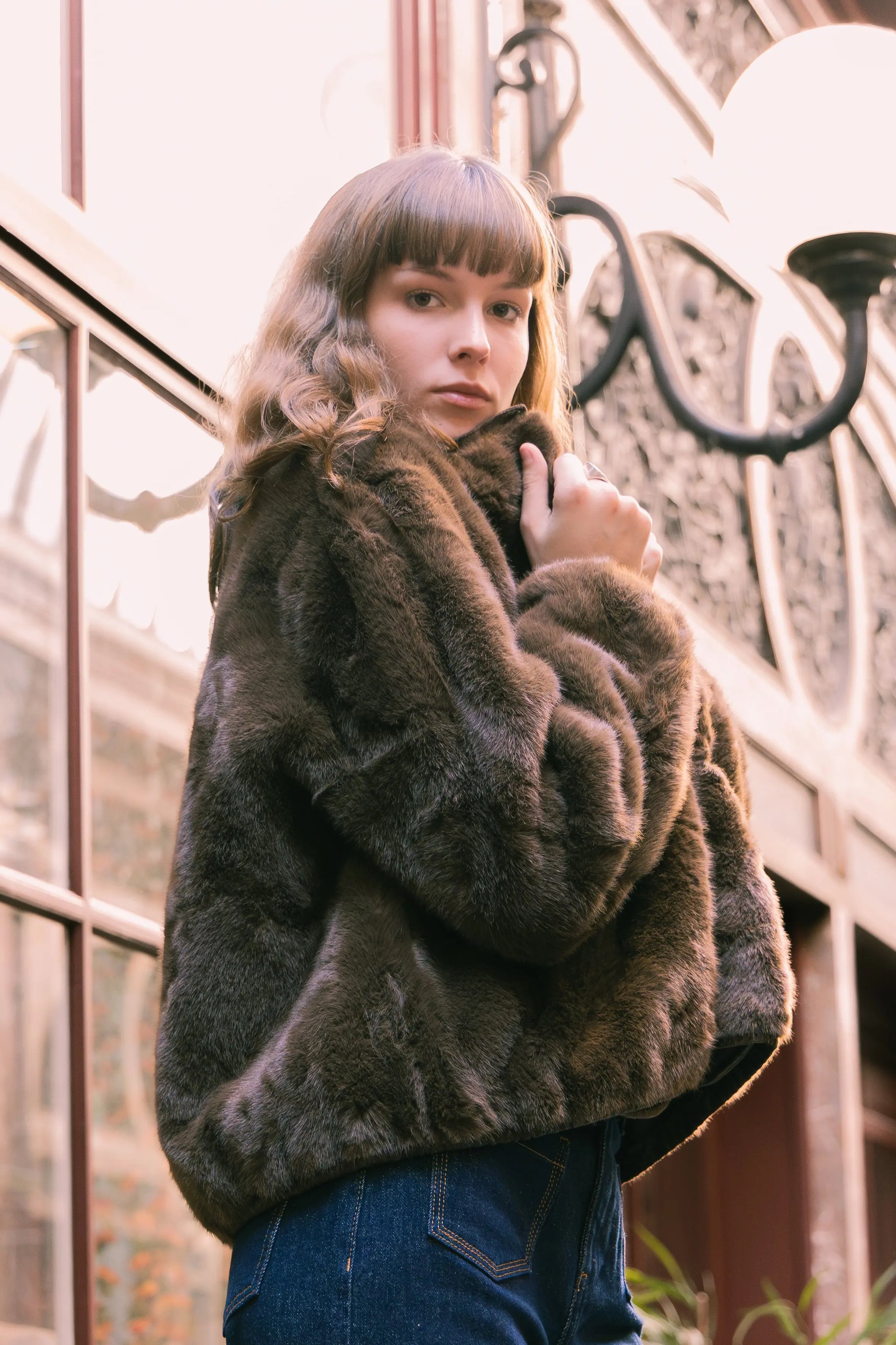 Ultra-soft faux fur cropped jacket. Straight cut, crew neck, and invisible snap closure. Tone-on-tone satin lining. Pair with a flowing dress or fitted pants for an elegant contrast of materials.