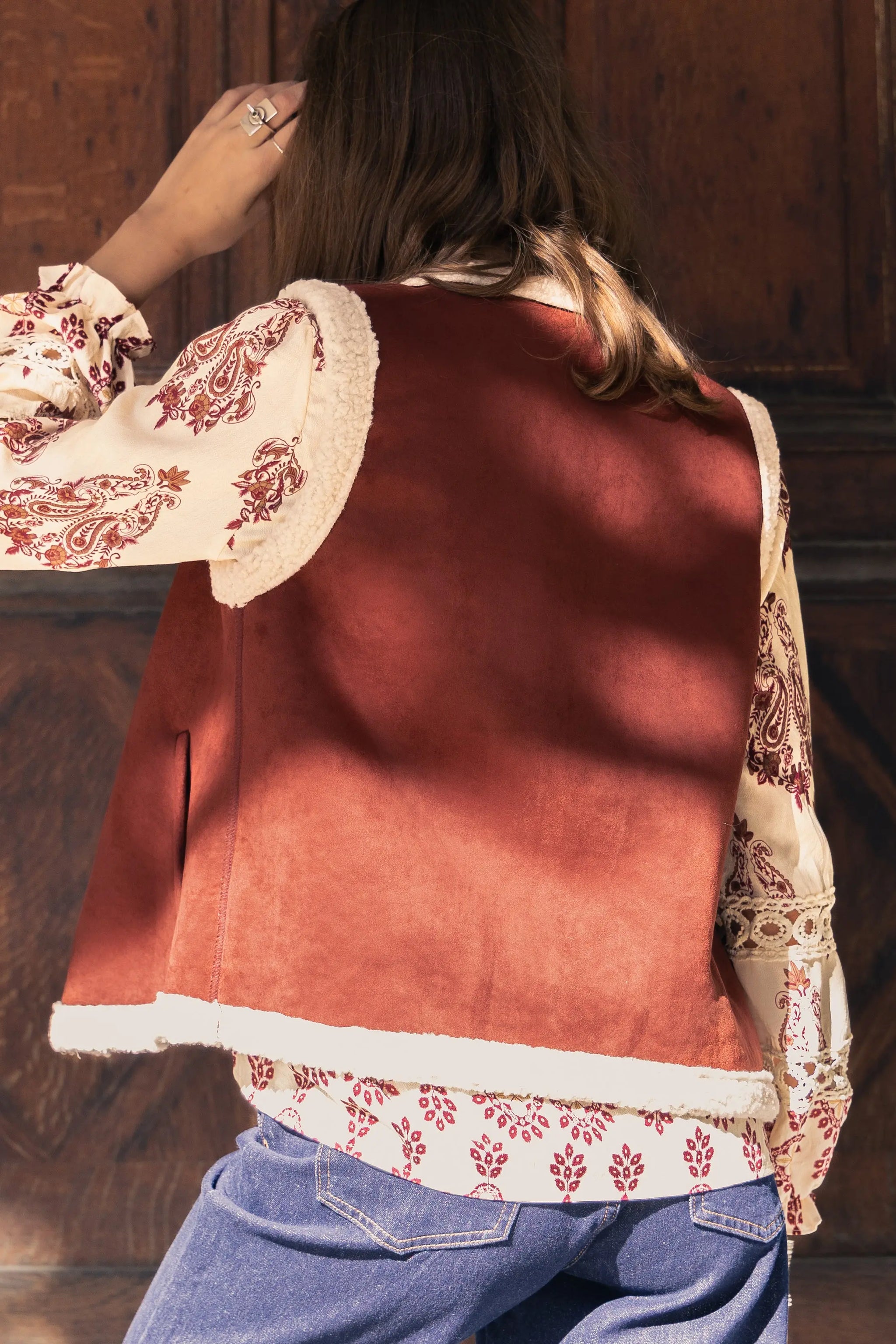 Sleeveless suede jacket with a sherpa-style lining. Snap button closure. Contrasting trim and discreet side pockets. A warm, practical, and stylish piece for mid-season. Available in khaki and navy.