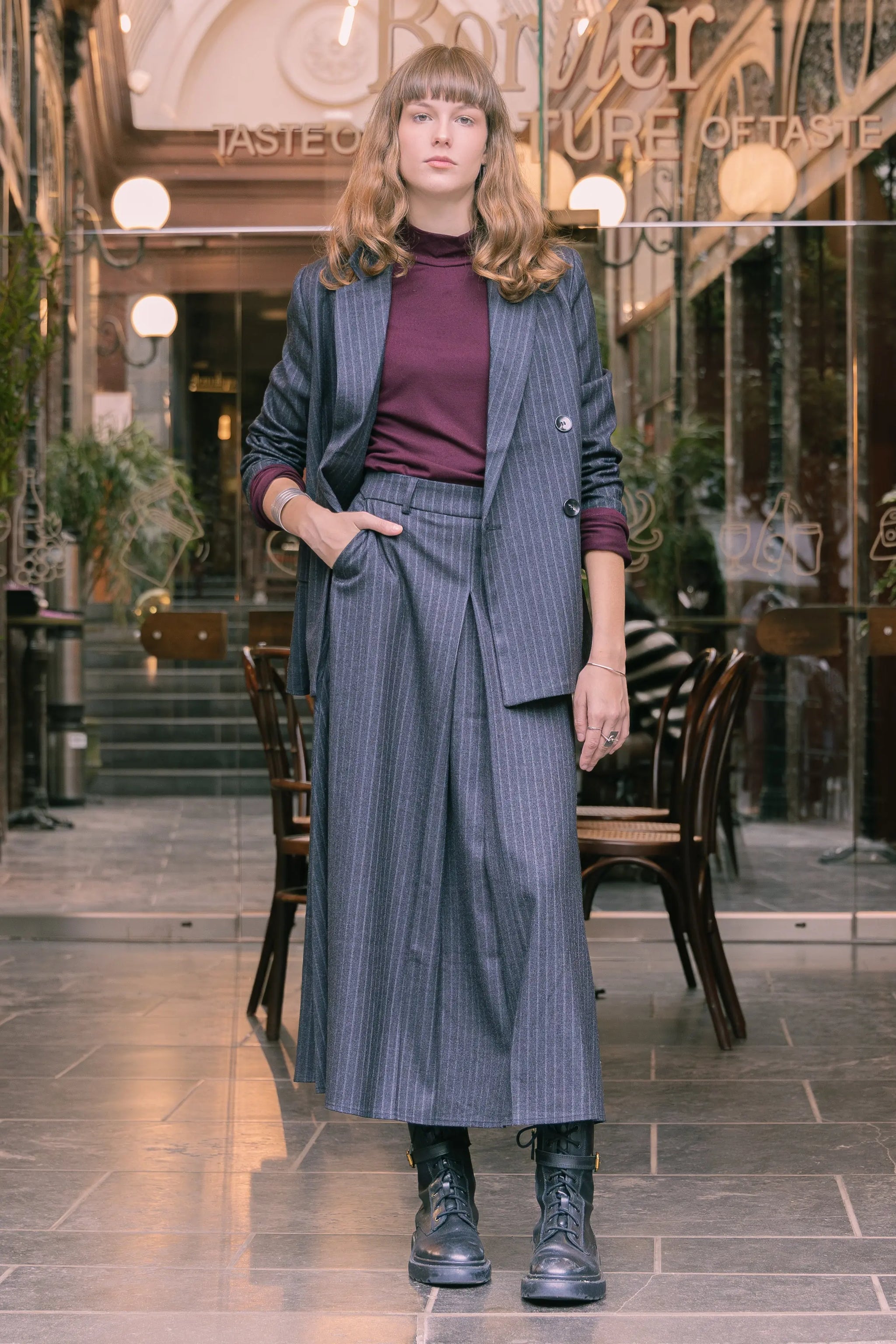 Striped flannel blazer jacket, revisited tailoring style with a straight cut, double-breasted and buttoned finish on the cuffs. Fully lined, it structures the silhouette without rigidity, and is distinguished by its fine tone-on-tone stripes. Wear as a total look with the CLÉMENCE skirt or mismatched with raw denim.