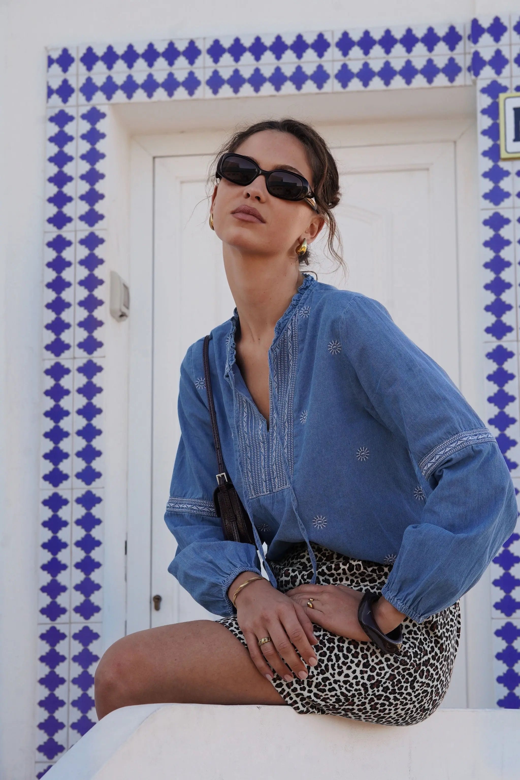 Embroidered cotton blouse. Tunisian collar with gathers and ties. Tone-on-tone geometric embroidery. Long sleeves with tightened cuffs. Straight cut. Faded blue.