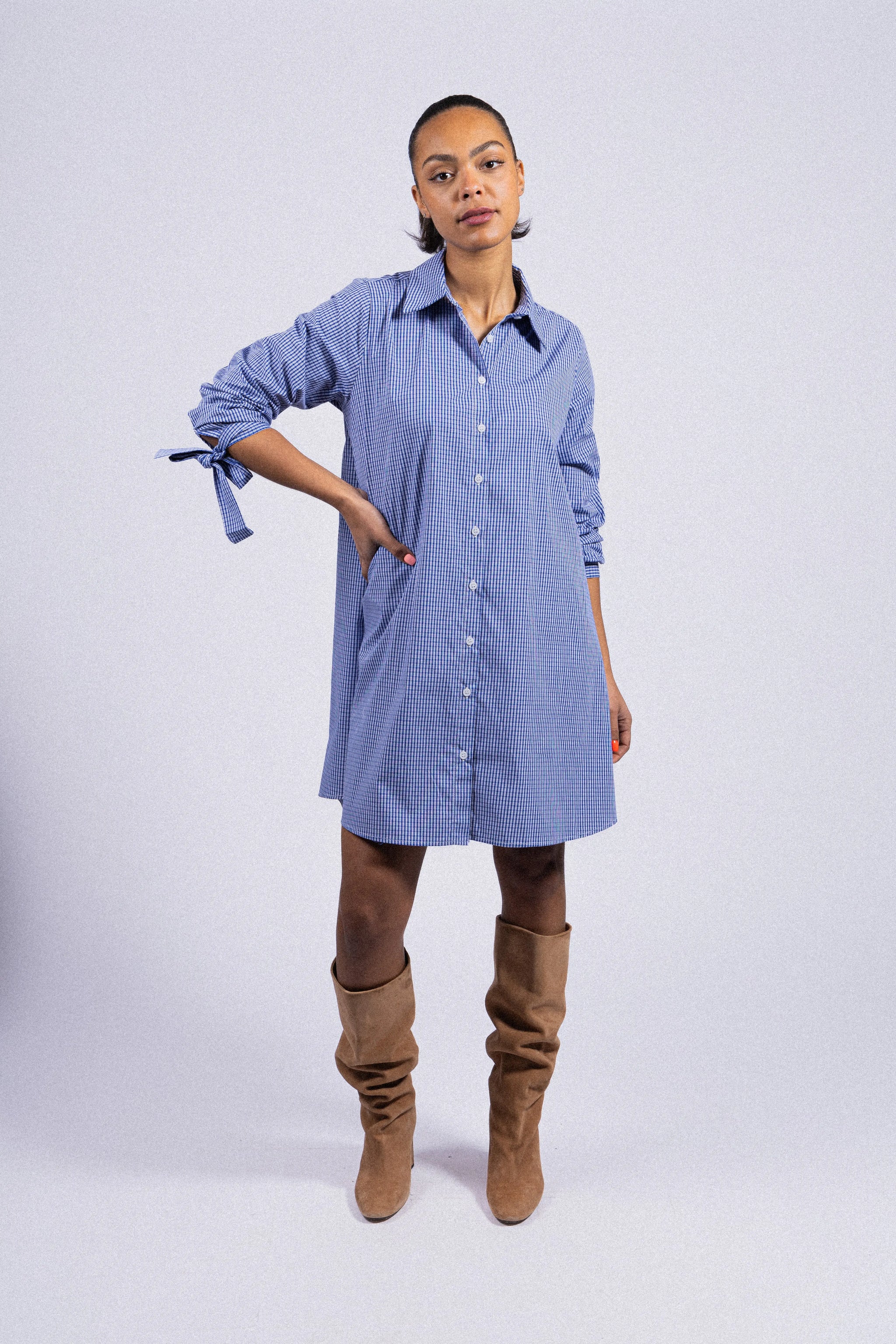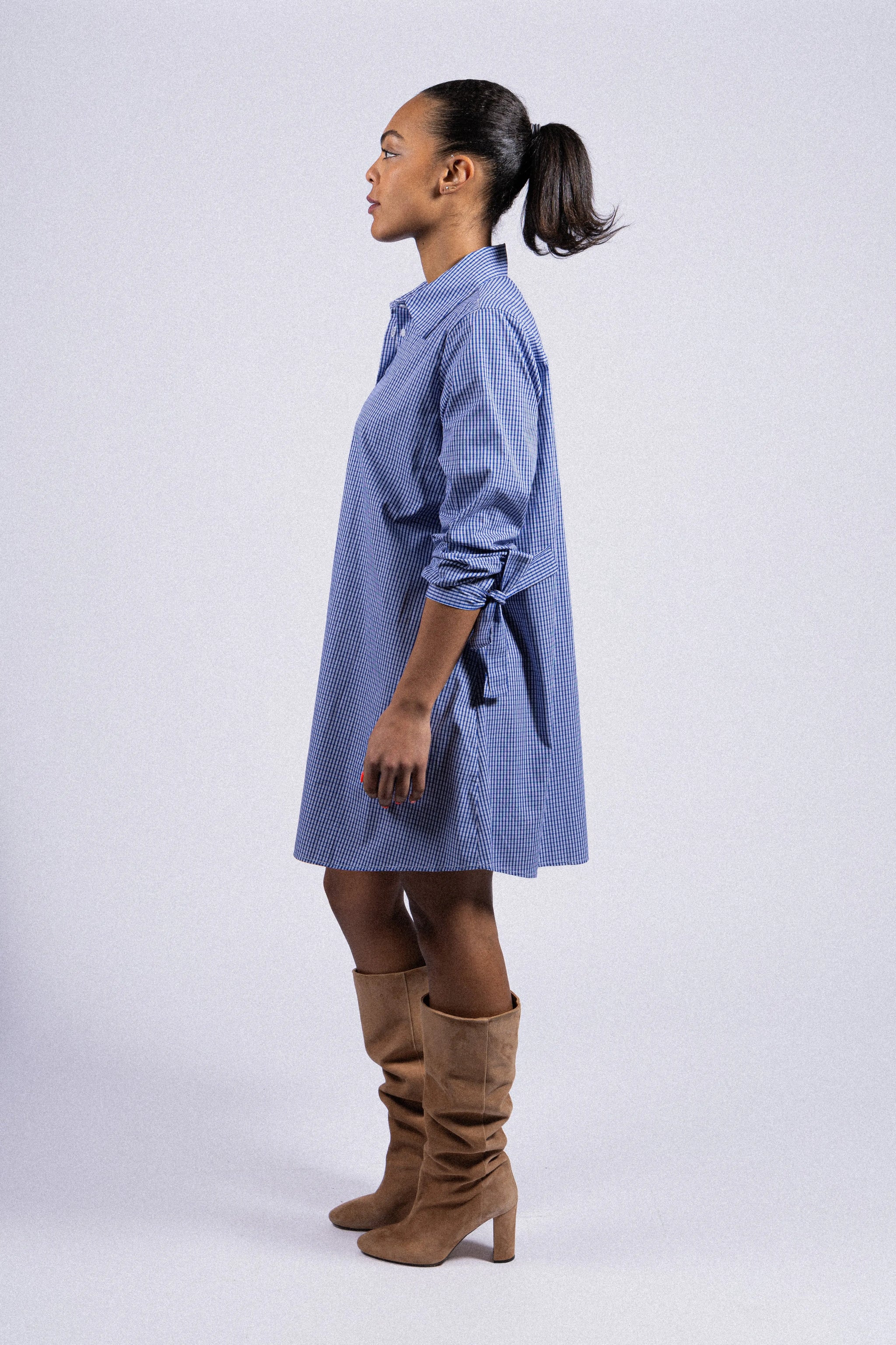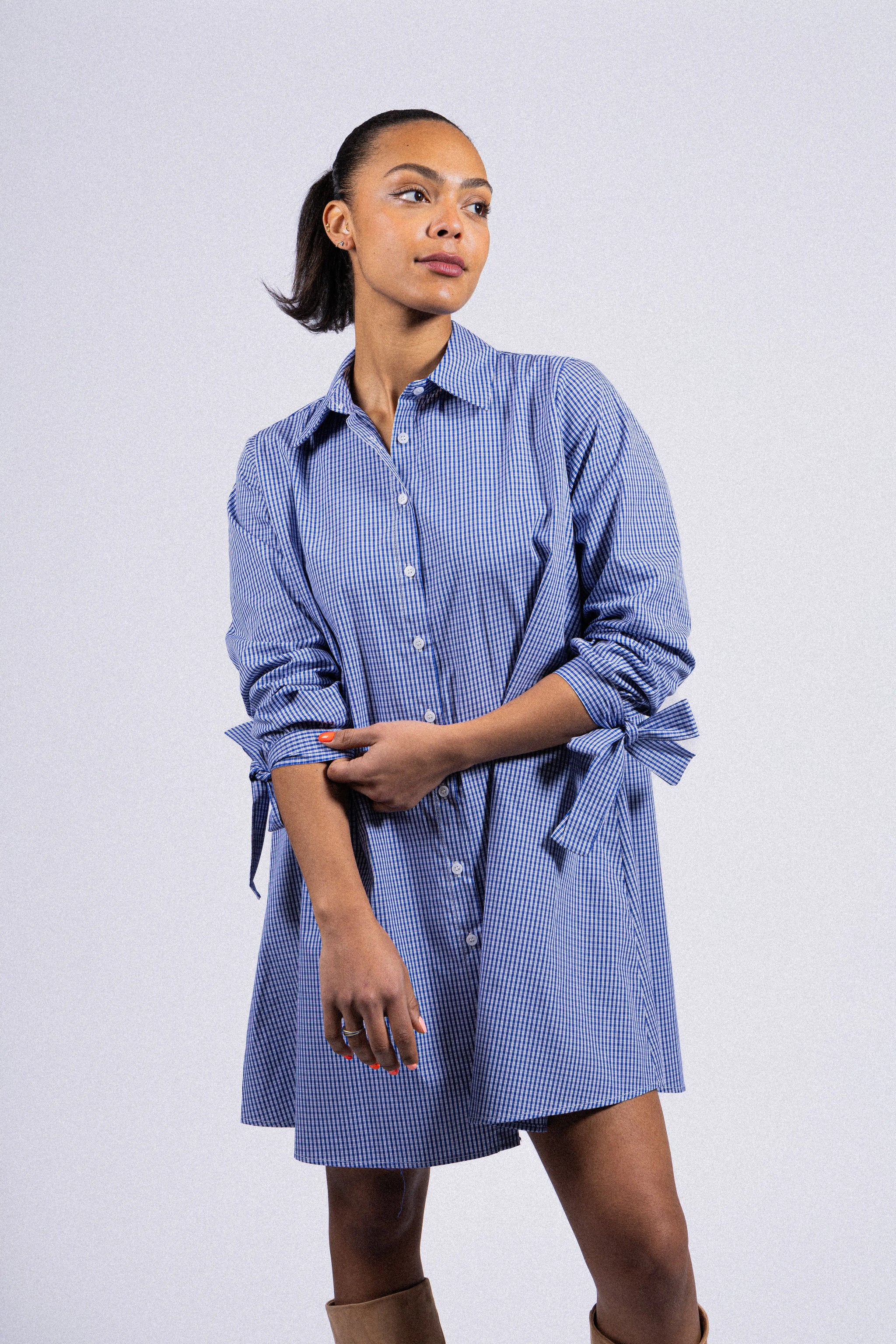Inspired by men's clothing, this cotton shirt dress features a loose fit and a blue and white gingham pattern for a chic yet casual look. The adjustable sleeves with bows add a touch of originality.