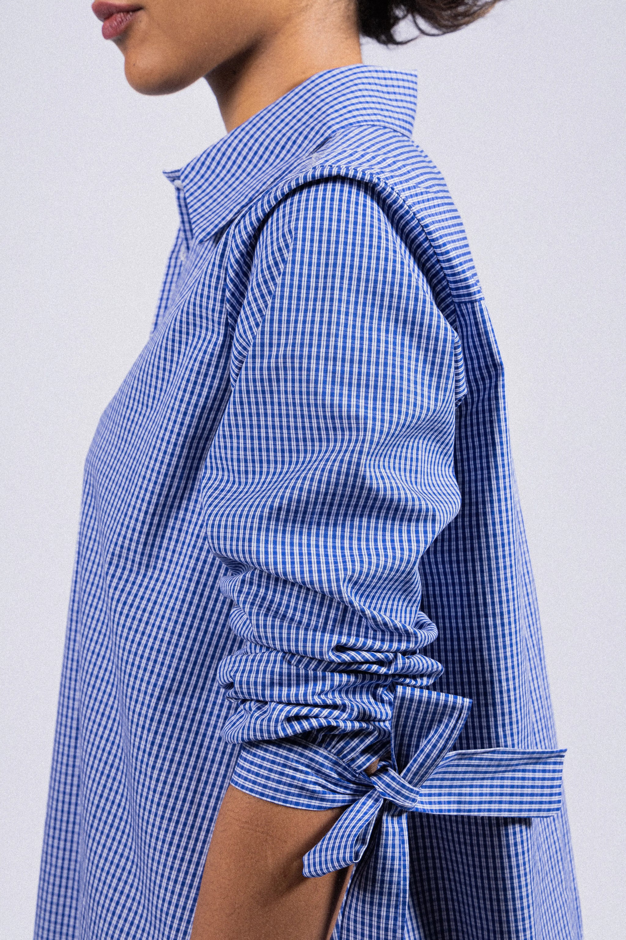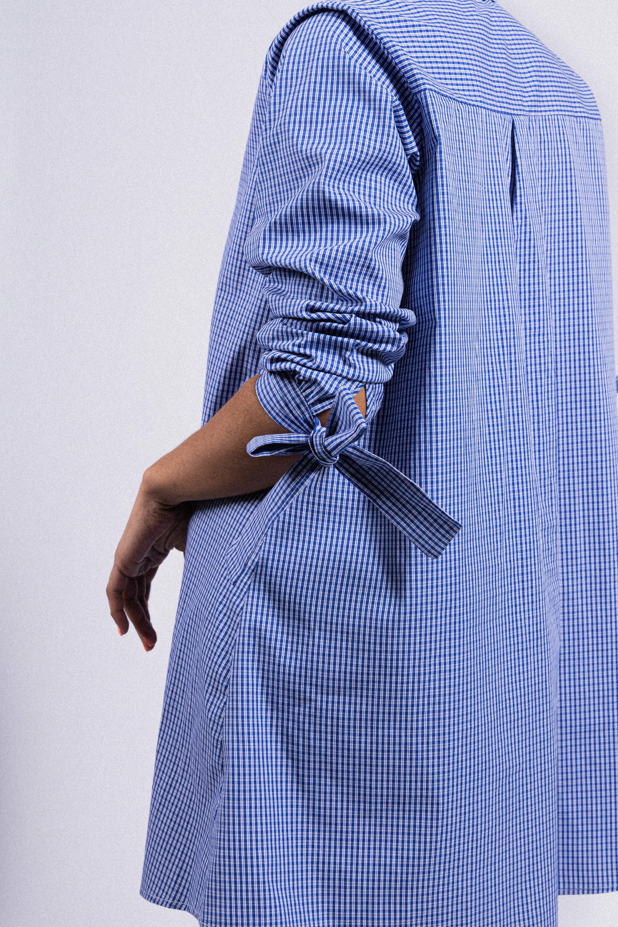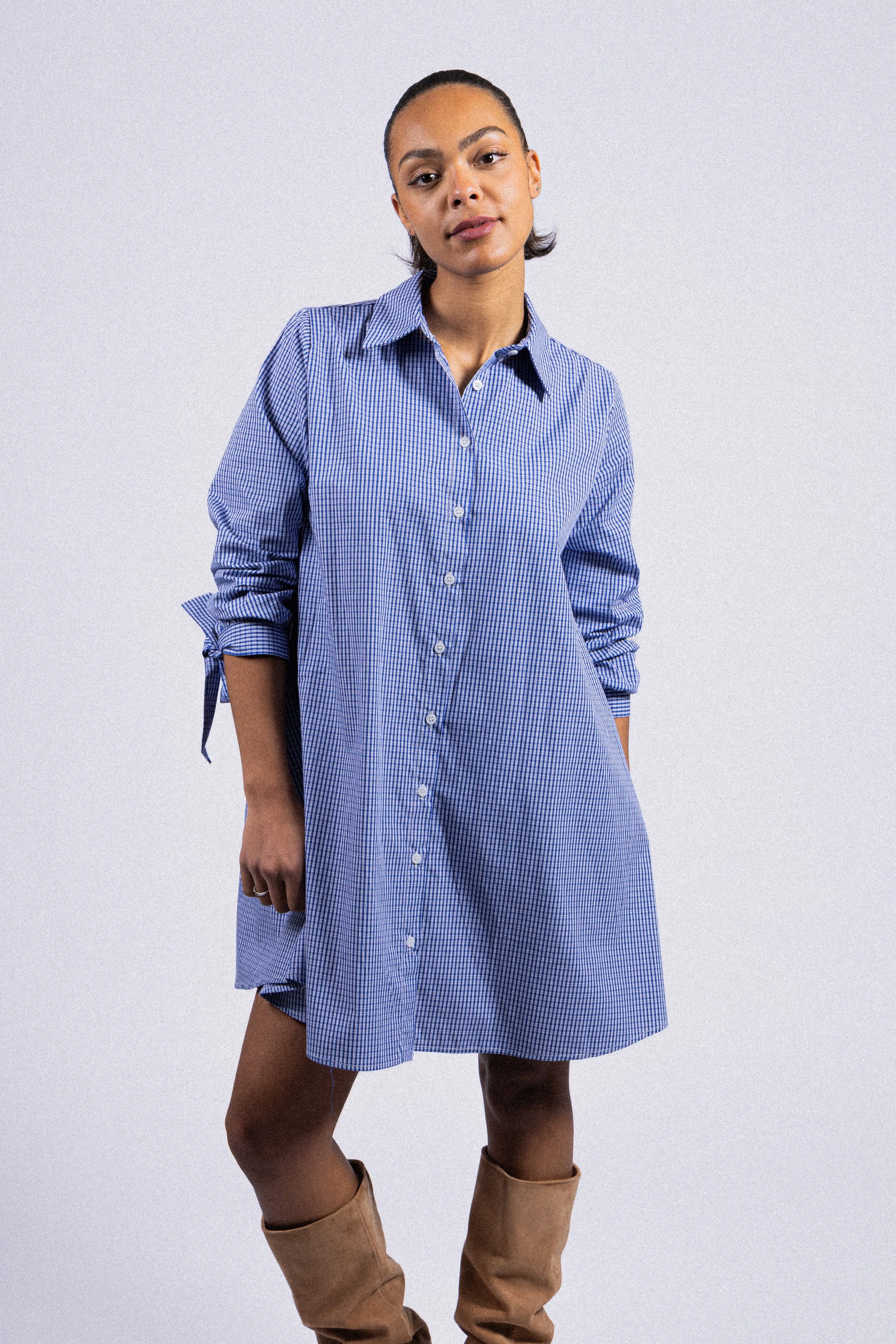 Inspired by men's clothing, this cotton shirt dress features a loose fit and a blue and white gingham pattern for a chic yet casual look. The adjustable sleeves with bows add a touch of originality.