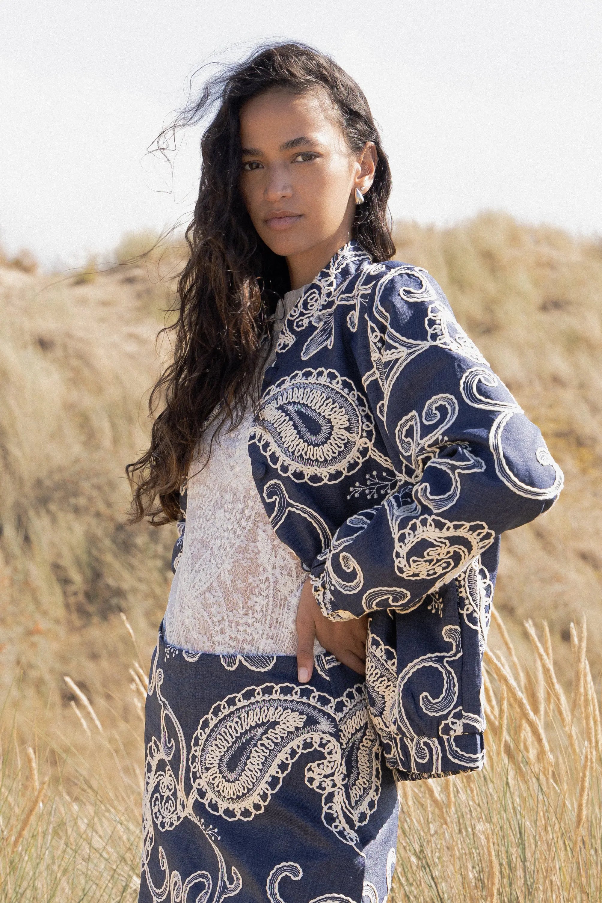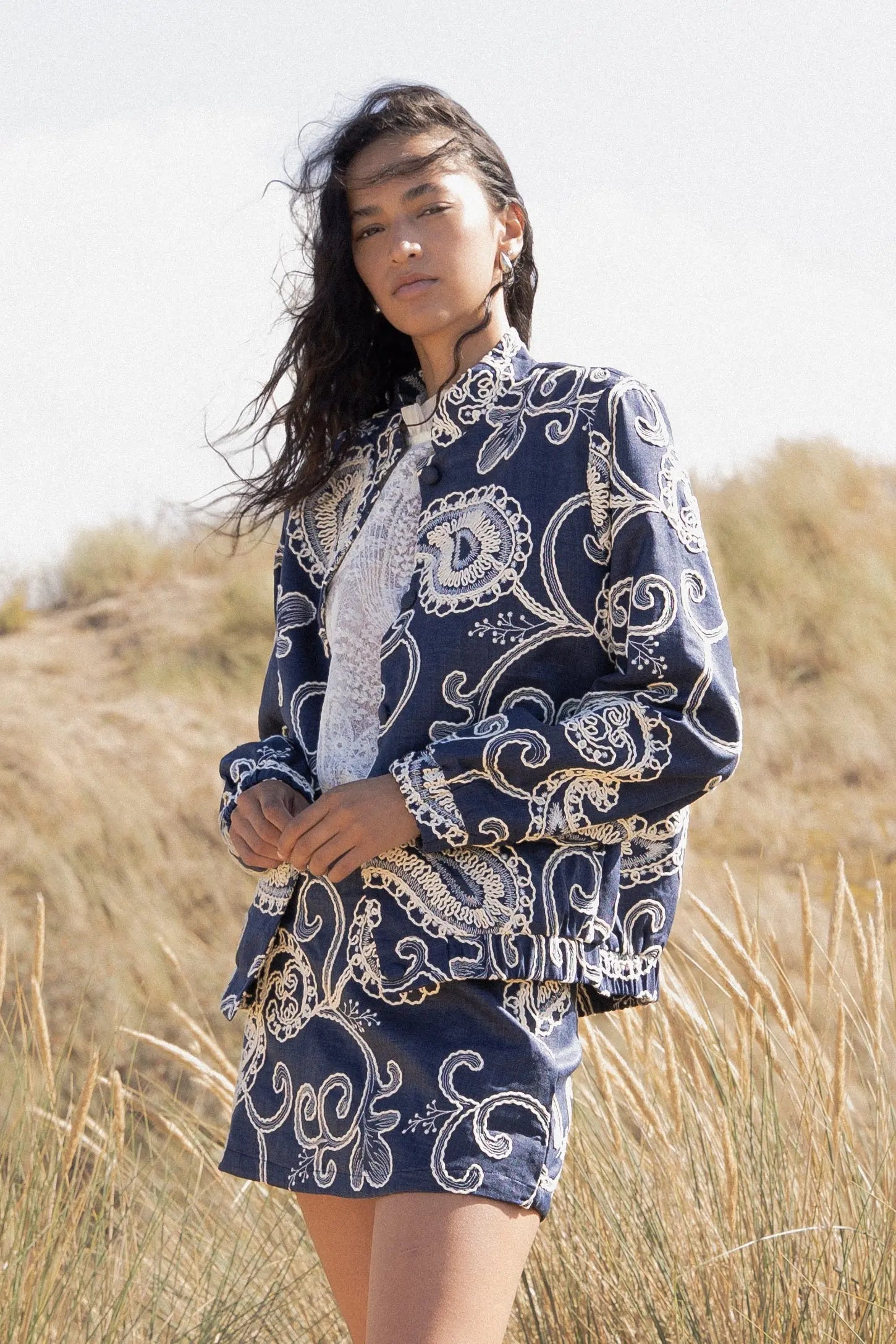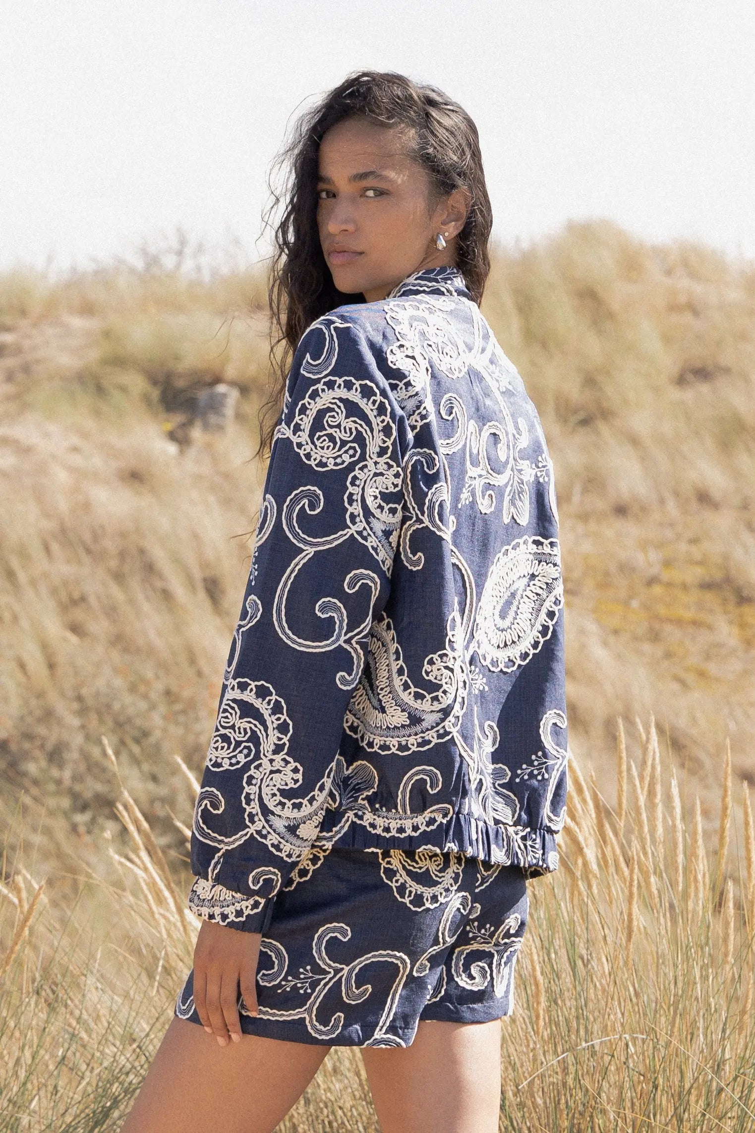 A bomber jacket reimagined with delicate embroidery that adds character and femininity. Pair it with jeans or a skirt to create a bold yet sophisticated look.