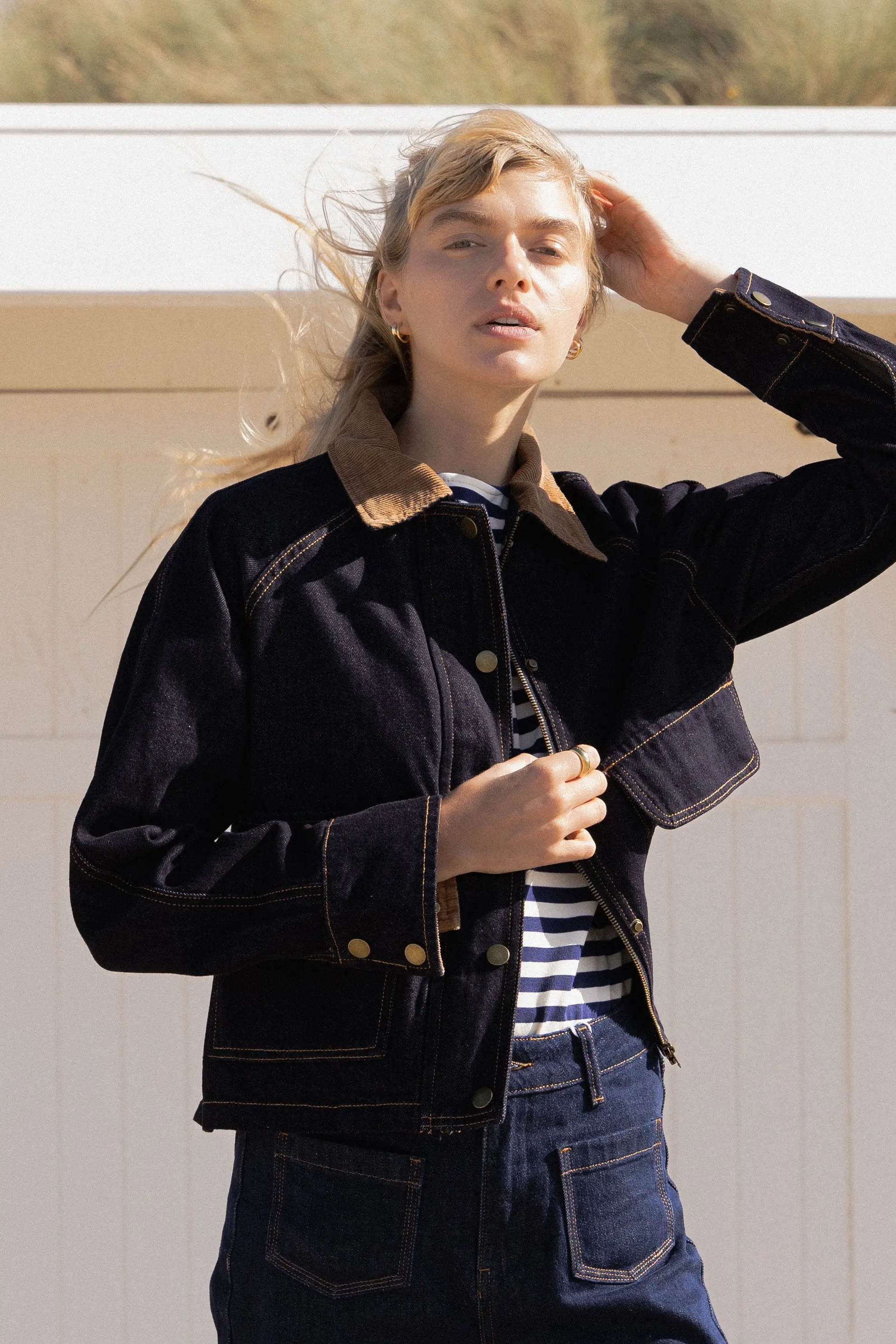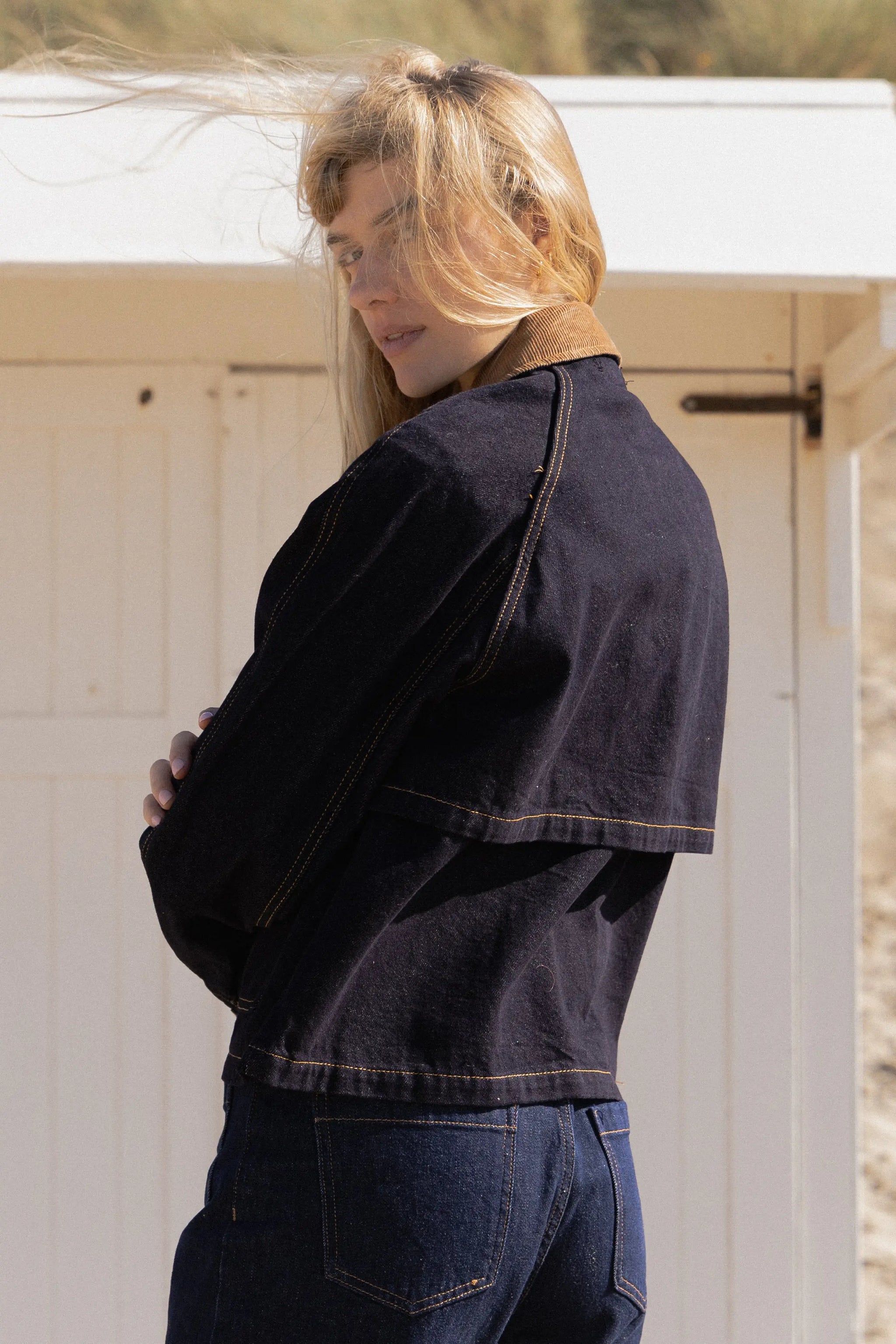A denim jacket reimagined with a modern cut and refined finishes. A timeless piece that transcends seasons and can be worn with wide-legged pants or a flowing dress.