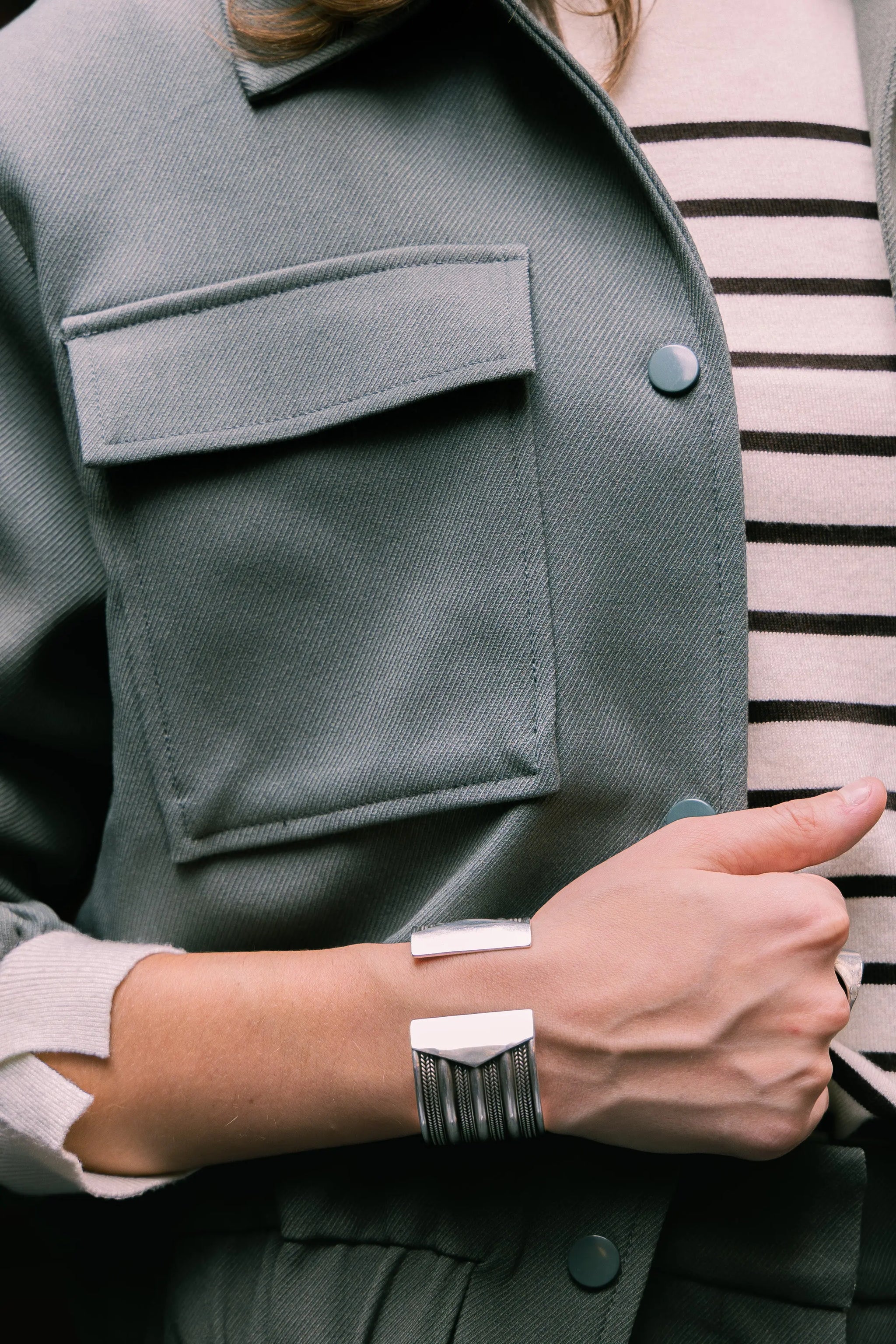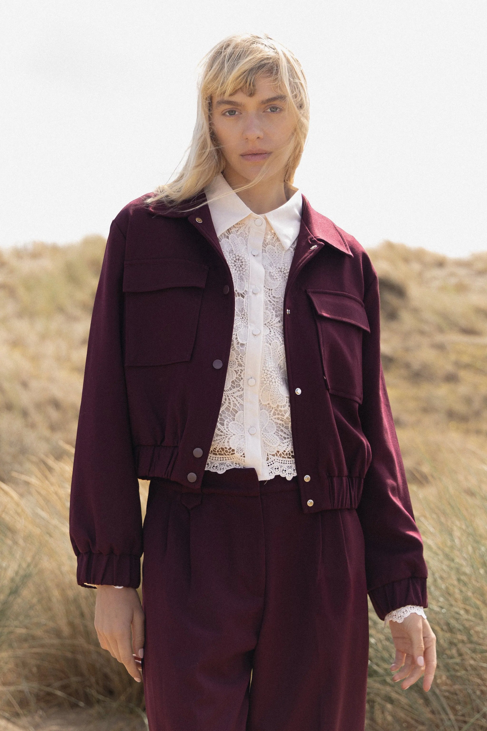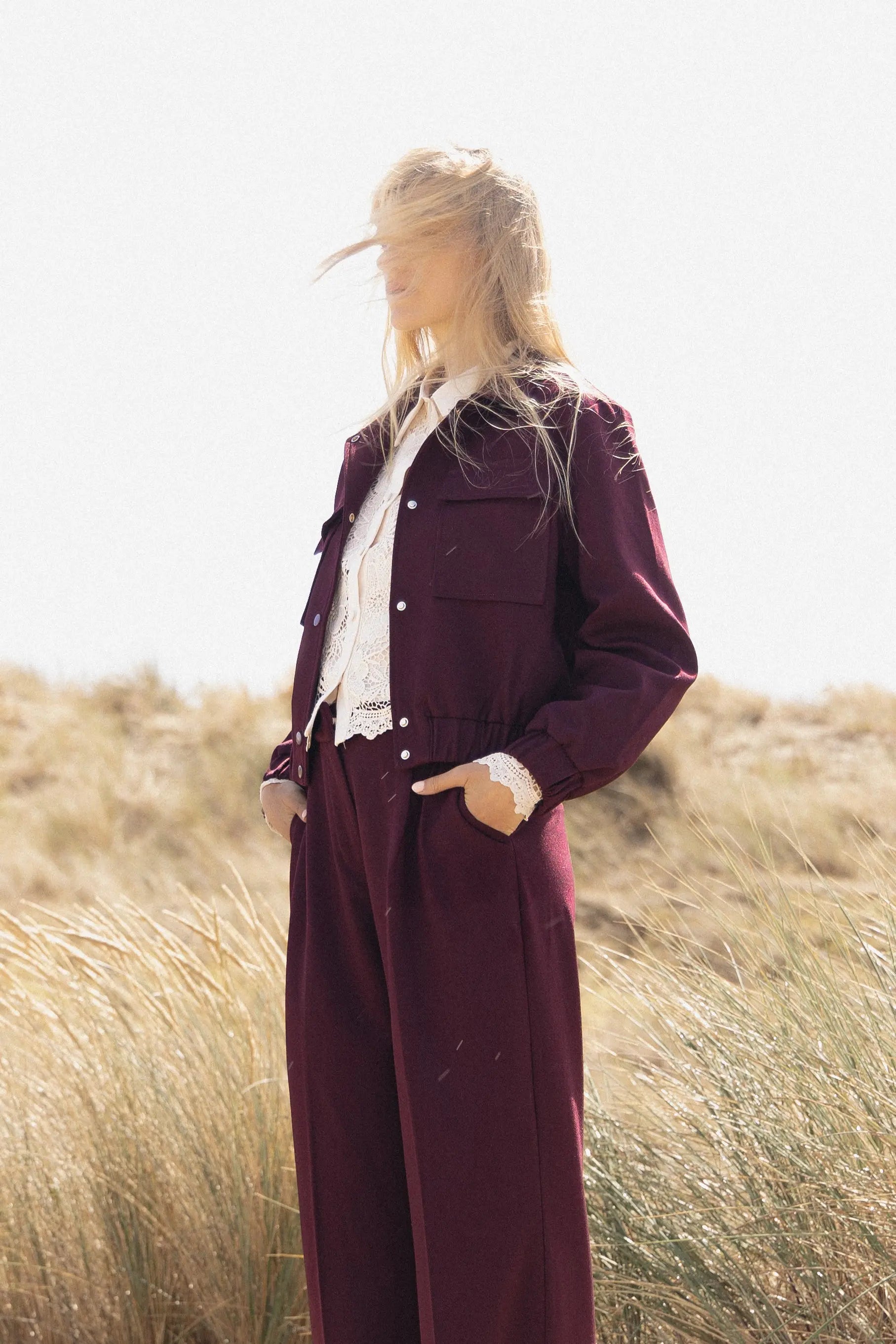 A bomber jacket revisited in a chic and modern version. Its short cut, patch pockets, and neat finish make it a must-have, to be paired with the matching wide-leg pants.