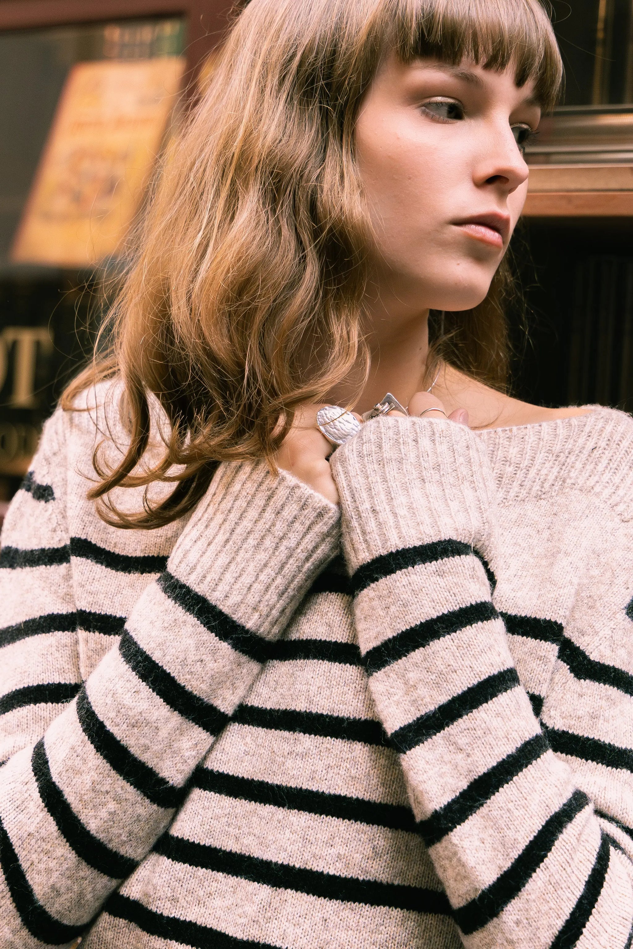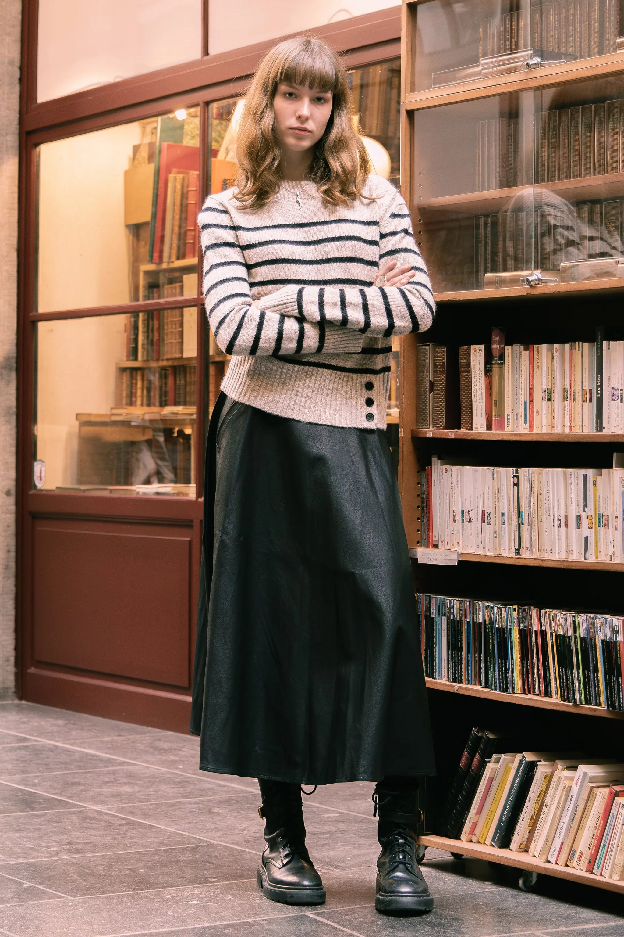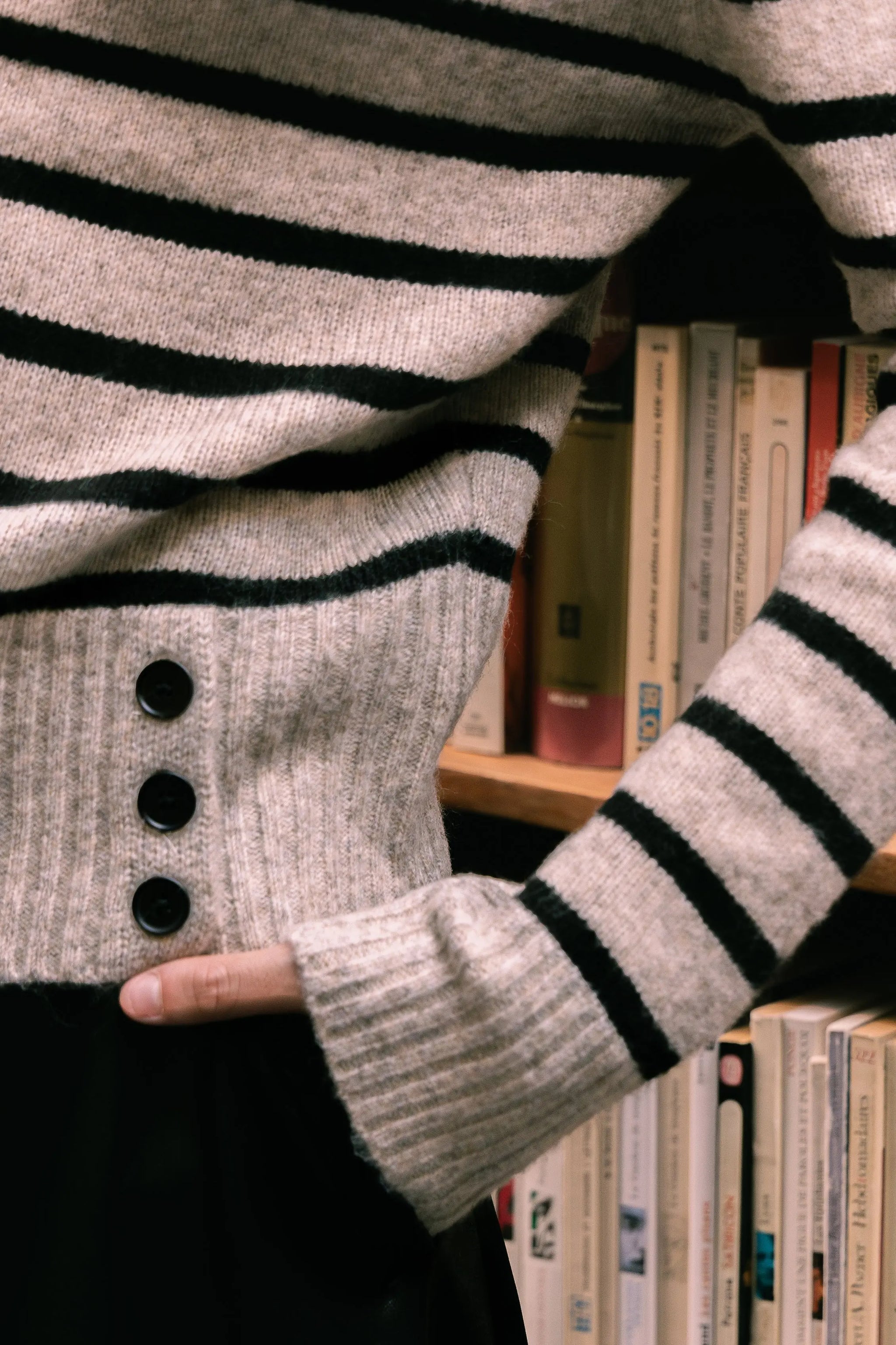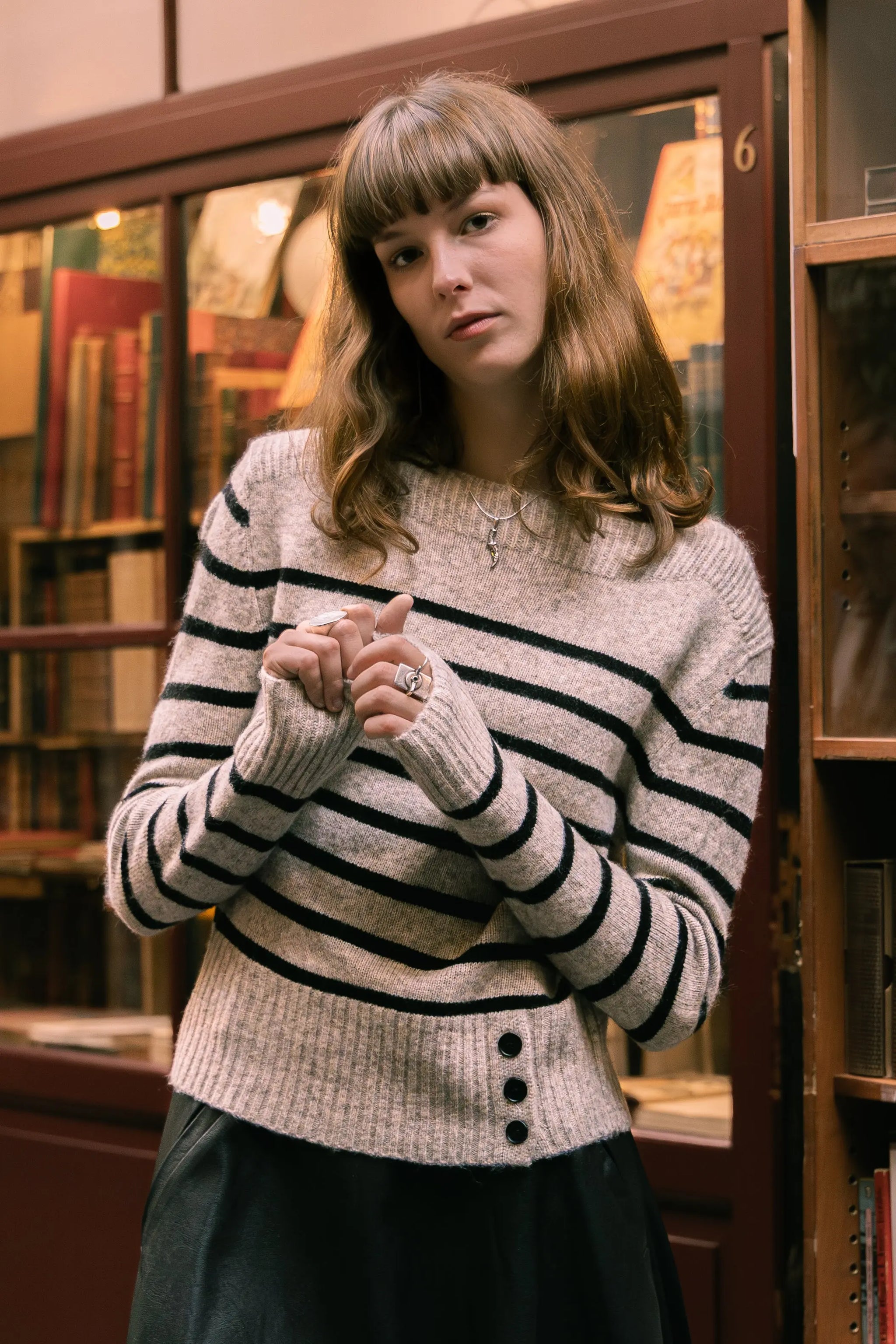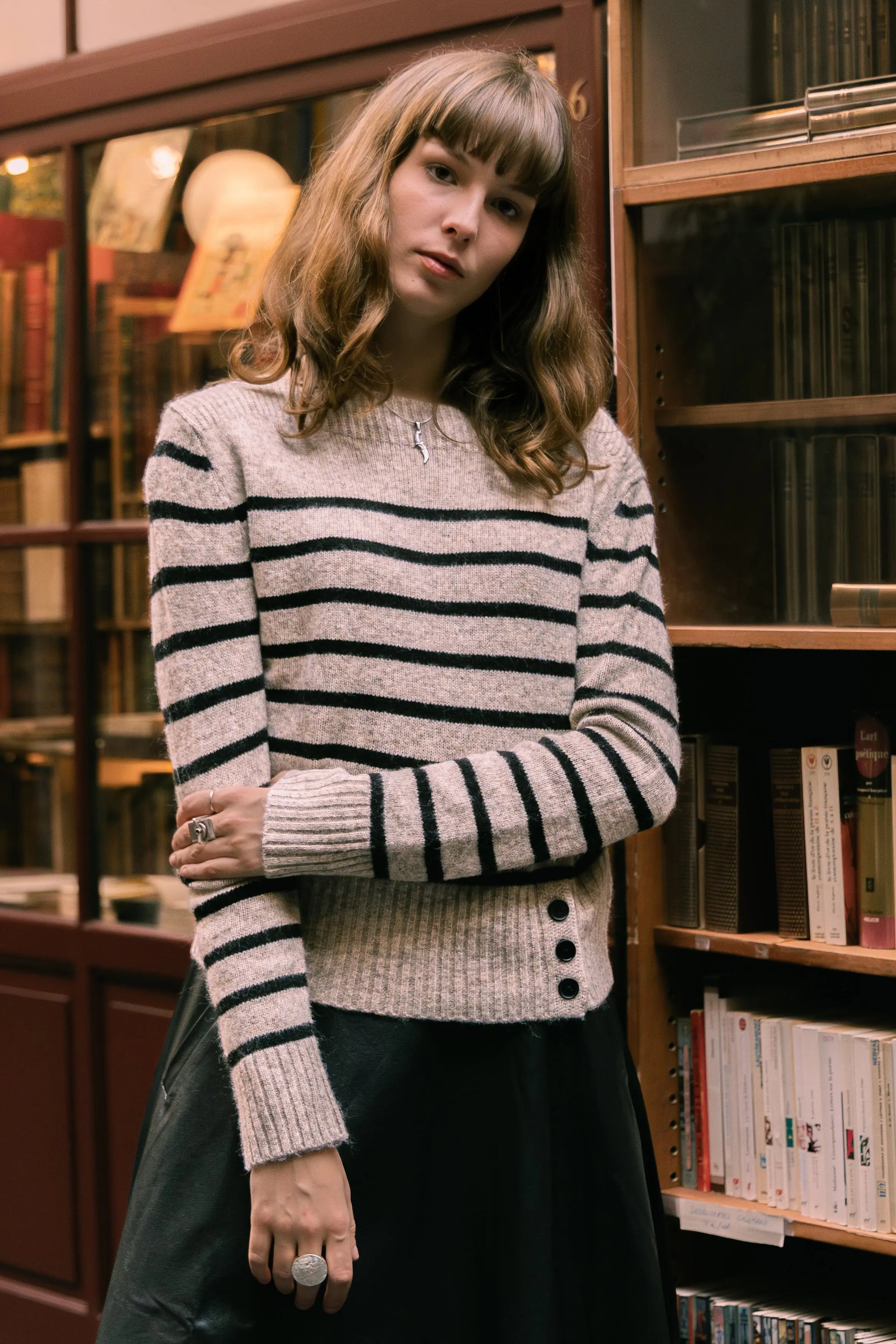 Soft knit sweater with contrasting horizontal stripes. Straight fit, scoop neck, ribbed sleeves and hem. Decorative button detail at the bottom of the bust for a subtle retro touch. Pair with leather pants or raw denim for a modern fall look.